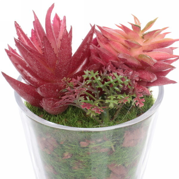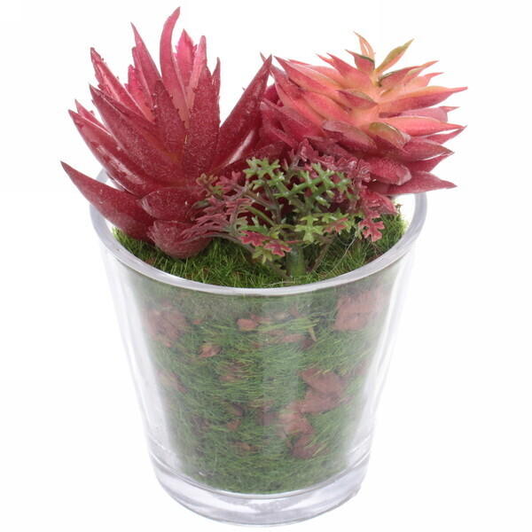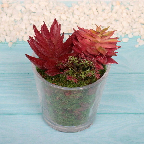 Цветок выполнен из качественного пластика и помещен в прозрачный стеклянный горшок, что придает ему стильный и современный вид. Внутри горшка находится искусственный зеленый мох и мелкие коричневые камушки, что создает эффект натуральности. Цветовая гамма включает оттенки красного и зеленого, что делает композицию яркой и привлекательной.