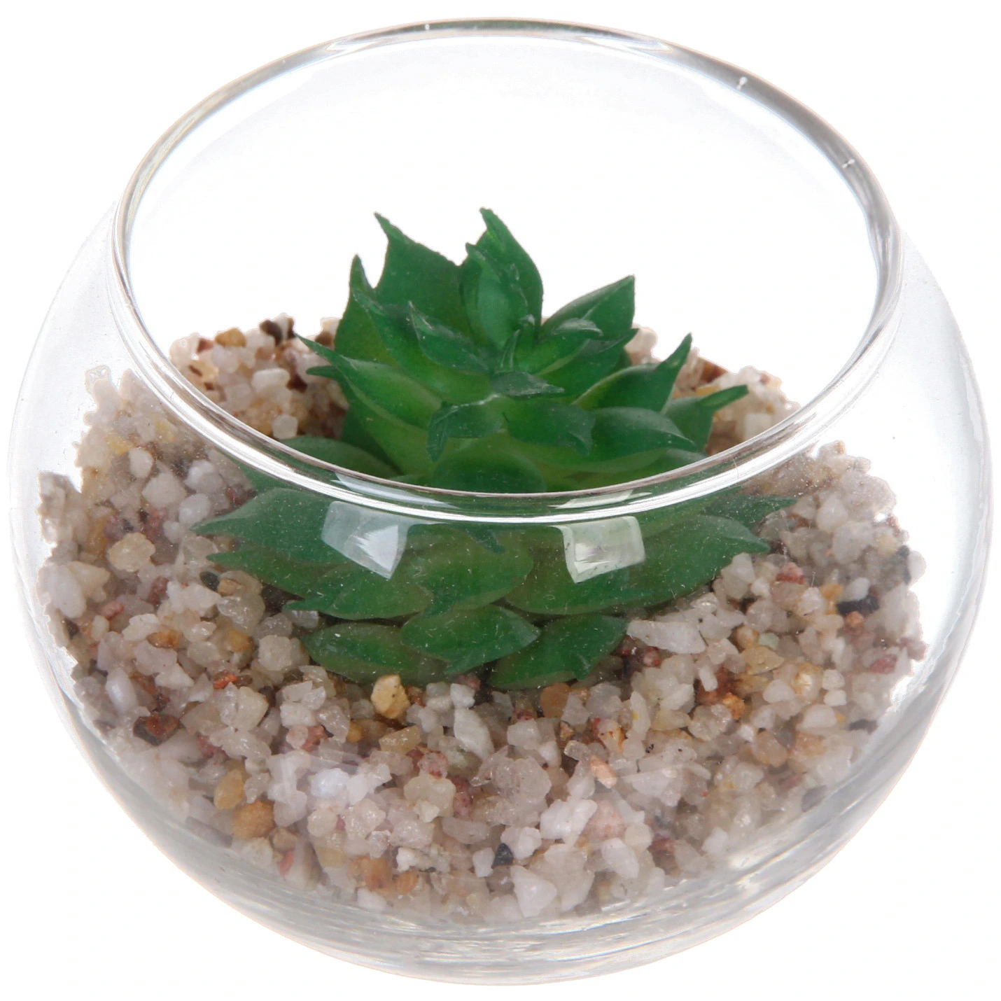 Декоративное растение имитирует настоящий суккулент с мясистыми листьями, собранными в аккуратную розетку. Оно помещено в прозрачный стеклянный горшок шарообразной формы с открытым верхом. Основание украшено слоем мелкого декоративного грунта (камешков) натуральных оттенков: белого, бежевого, коричневого и серого. Эта деталь делает композицию завершённой и очень естественной.