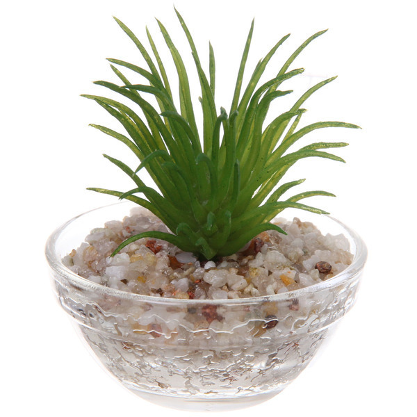Цветок выполнен в зелёном цвете с длинными, тонкими листьями, имитирующими траву. Стеклянный горшок имеет круглую форму с рифлёной поверхностью и заполнен крупной каменной крошкой, создающей эффект дренажного слоя. Этот элемент декора станет не только красивым, но и практичным дополнением вашего интерьера.