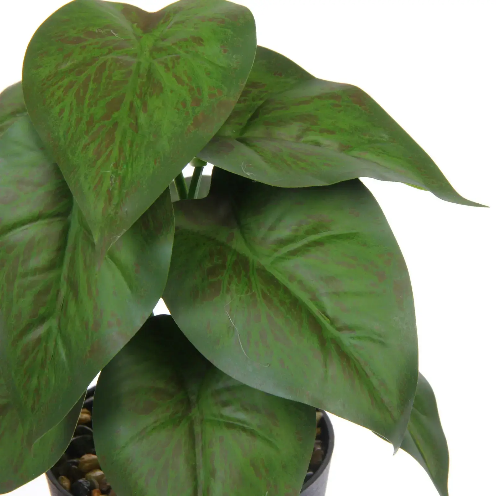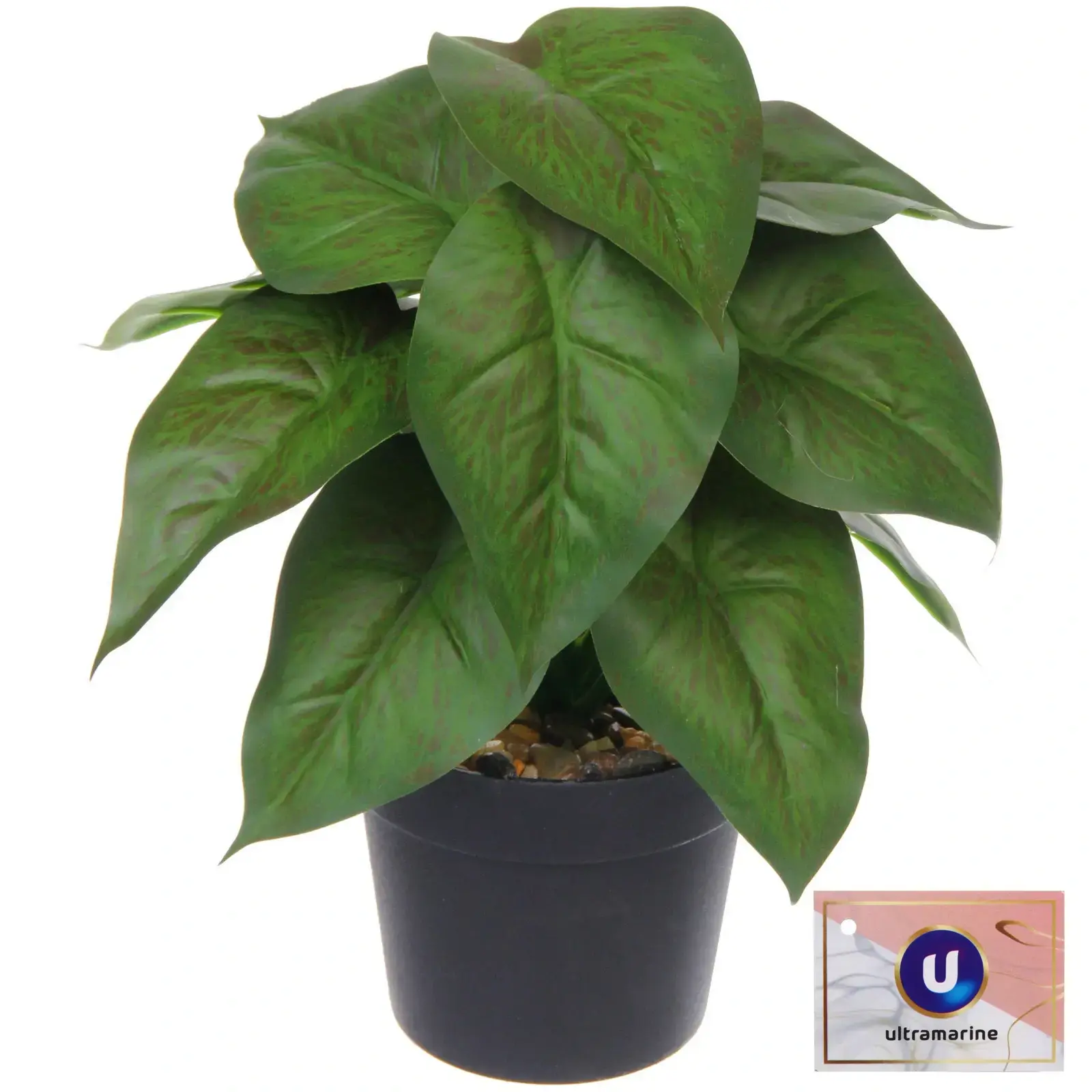 Цветок имеет высоту 22 см и помещен в стильный черный пластиковый горшок, внутри которого находятся декоративные камушки. Листья имеют различные оттенки зеленого и текстуру с прожилками, что придает им естественность. Этот элемент декора станет отличным дополнением к любому интерьеру, подчеркивая ваш стиль и вкус.