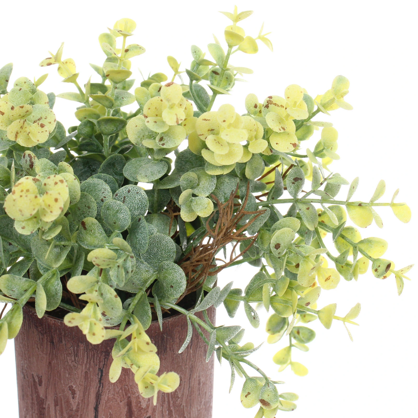 - Готовое решение. Эвкалипт уже посажен в стильное кашпо, имитирующее древесную кору с красивой коричневой фактурой. Вам не нужно искать подходящий горшок — композиция полностью готова к использованию.