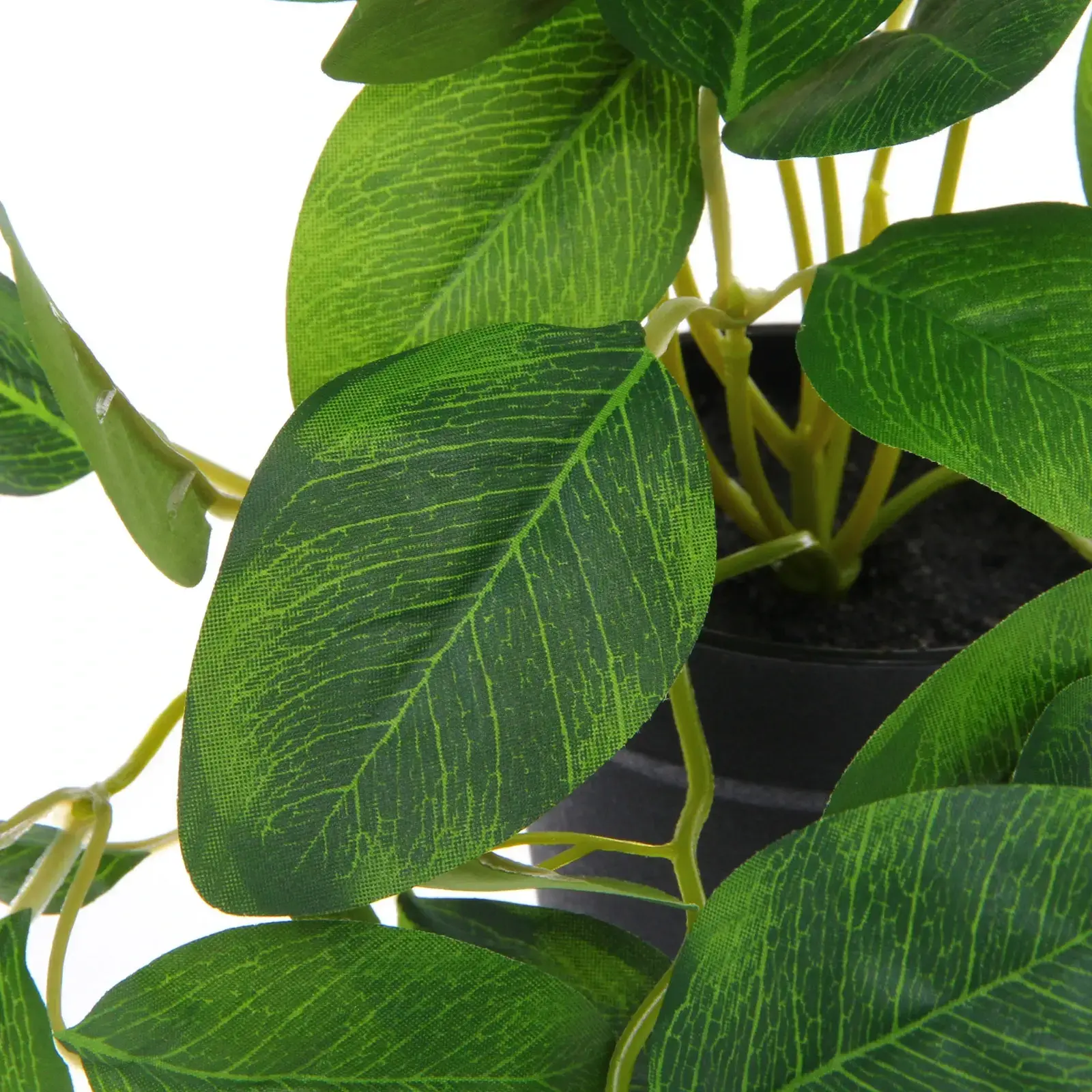 Цветок имеет высоту 20 см и помещен в стильный черный горшок, который гармонично впишется в любой интерьер. Листья выполнены из пластика, что обеспечивает их долговечность и легкость. Разнообразные оттенки зеленого и проработанные детали делают этот цветок идеальным выбором для создания уютной атмосферы в вашем доме.