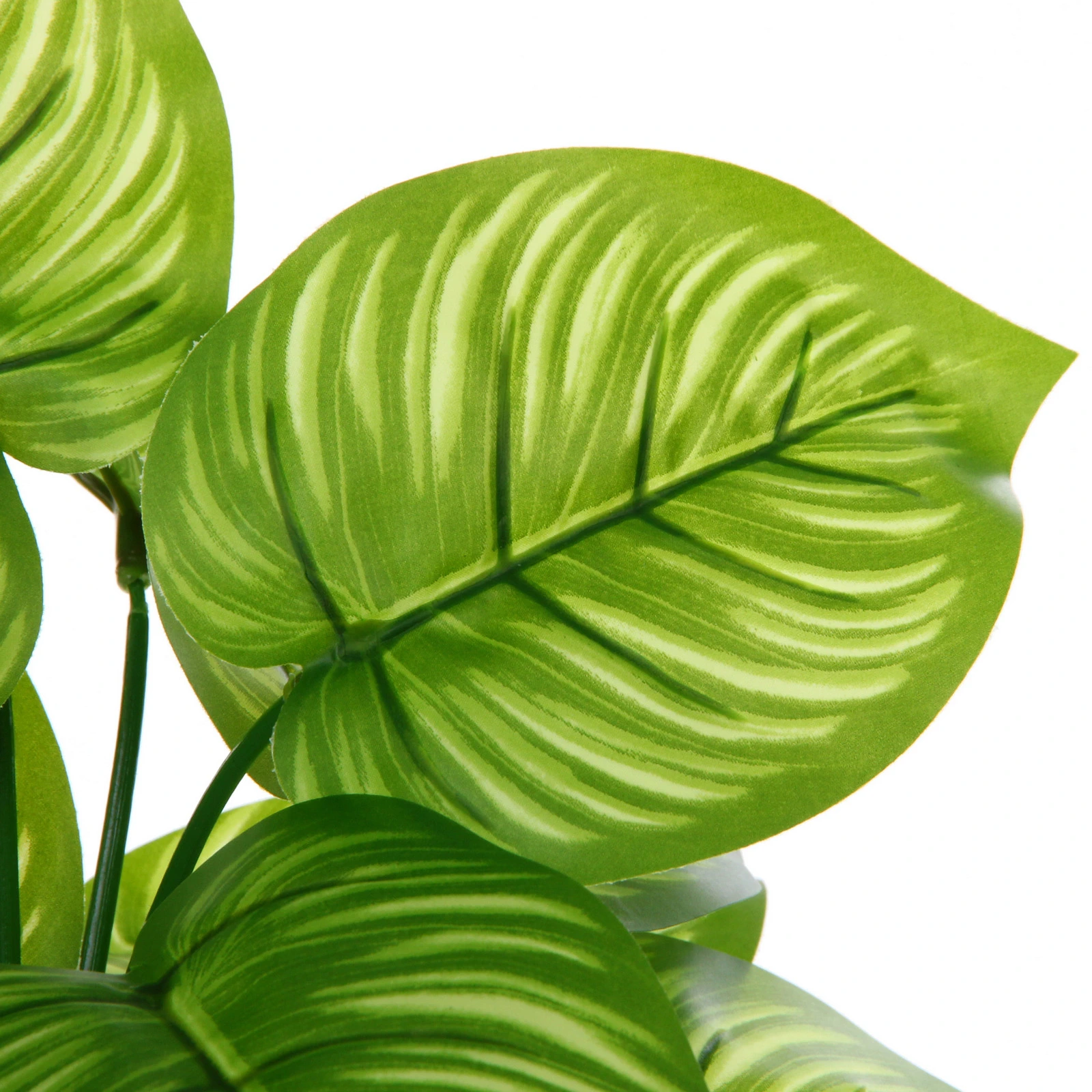 Растение представляет собой пучок отдельных стеблей с крупными овальными листьями, собранными в пышную розетку. Каждый лист имеет чёткую центральную жилку и изящный рисунок из светлых полос. Стебли зелёного цвета естественно имитируют настоящие. Горшок цилиндрической формы, матово-чёрный, что делает его нейтральным и сочетаемым с любым стилем интерьера. Верх горшка заполнен декоративными камешками разных оттенков коричневого, бежевого и серого, что добавляет композиции завершённости и натуральности.