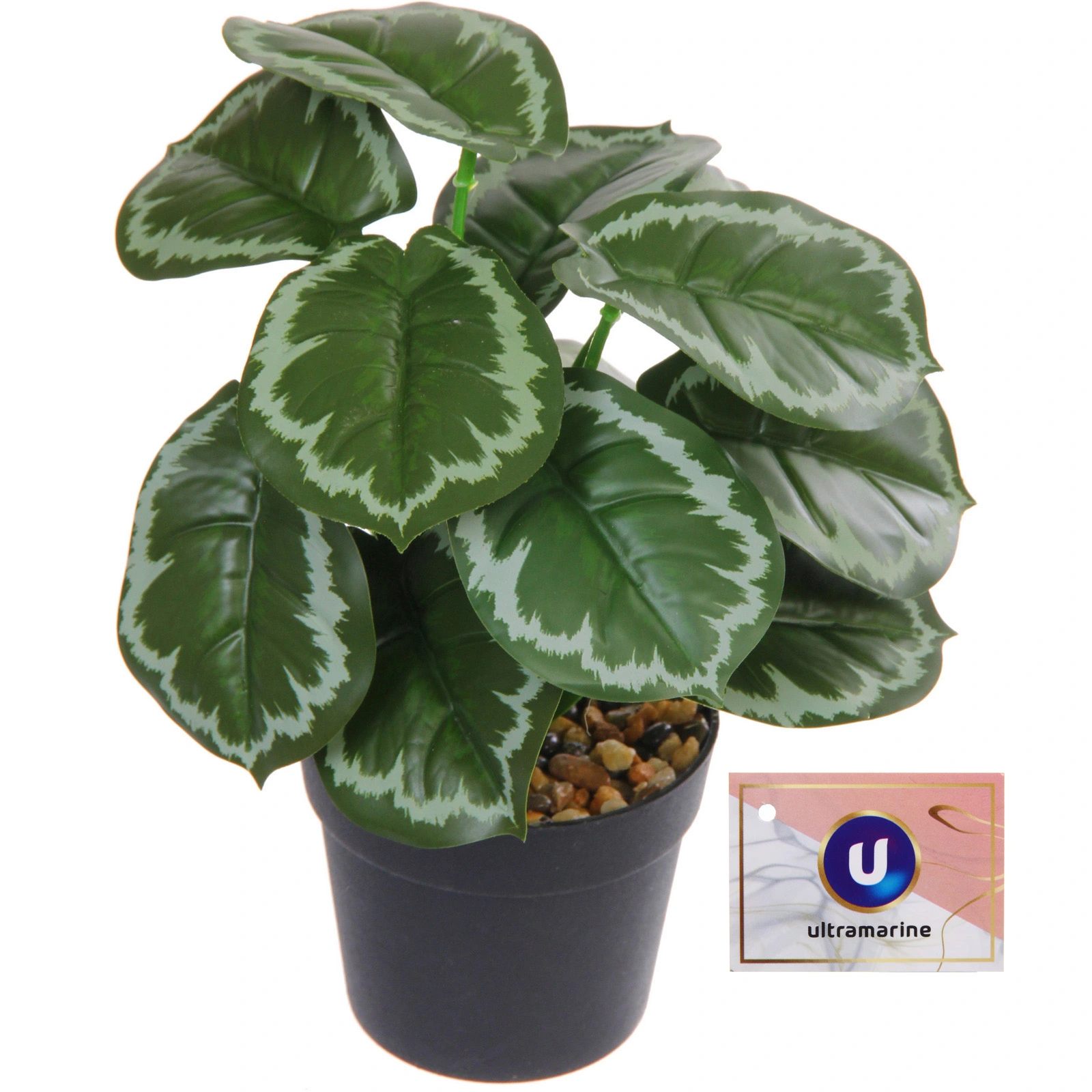 Растение представляет собой плотный пучок из нескольких стеблей с крупными овально-заострёнными листьями. Общая высота композиции составляет 22 см. Горшок цилиндрической формы, матовый, выполнен в классическом чёрном цвете, который гармонично впишется в любой интерьер – от минимализма до лофта. Верх горшка украшен декоративным слоем из мелких камешков различных оттенков коричневого, жёлтого и чёрного, что добавляет композиции натуральности и завершённости.