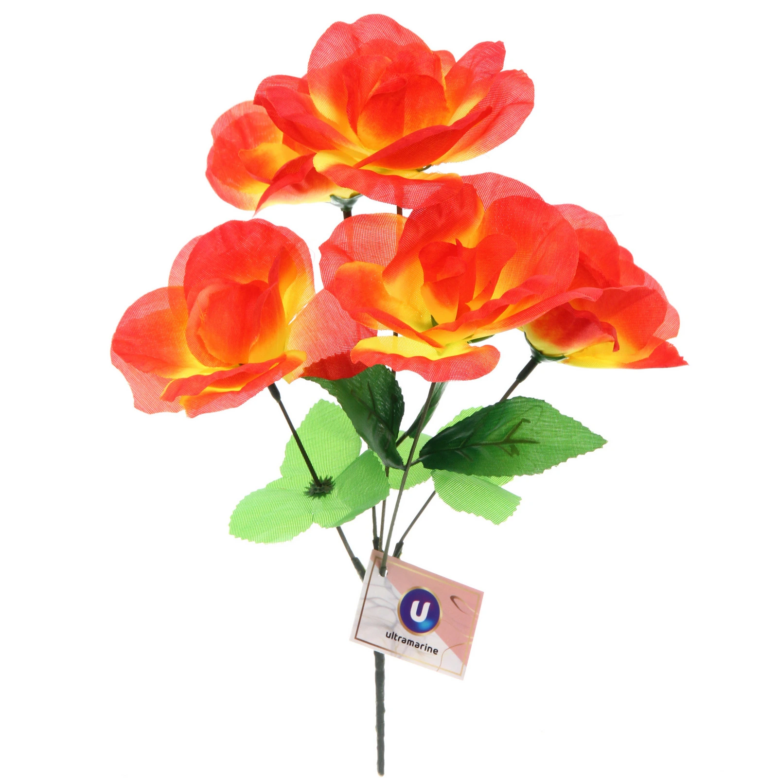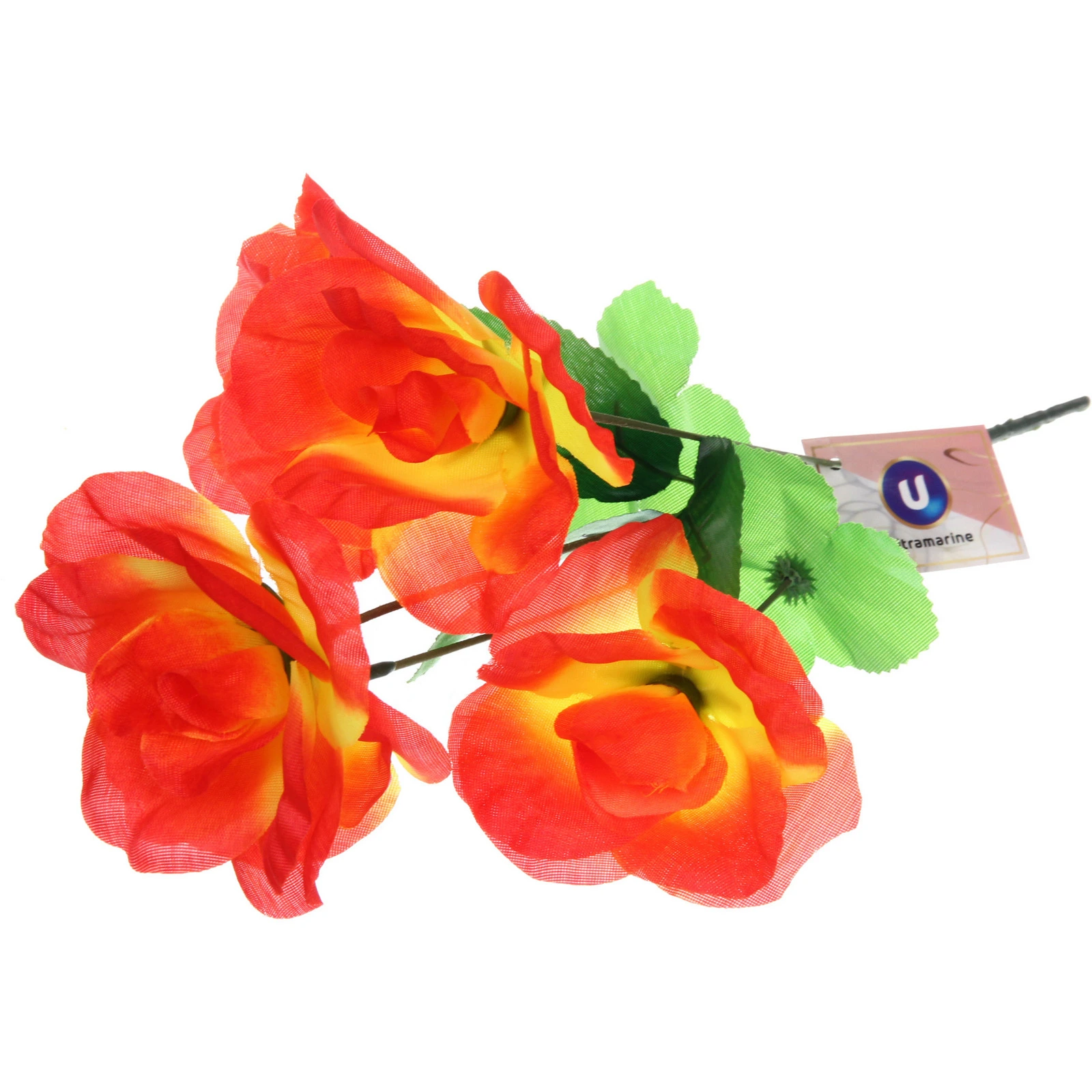 Вы получаете одну ветку с пятью искусственными цветками. Цветы в ассортименте могут иметь оттенки красного, желтого и оранжевого с плавными переходами, как показано на фото. Каждый цветок состоит из нескольких слоев полупрозрачных лепестков, собранных в изящный бутон. Зеленые чашелистики и листья с выраженной фактурой прожилок дополняют реалистичный образ. Стебли тонкие, темно-зеленого цвета. Материалы изготовления – пластик и полиэстер, обеспечивающие прочность и сохранение формы.