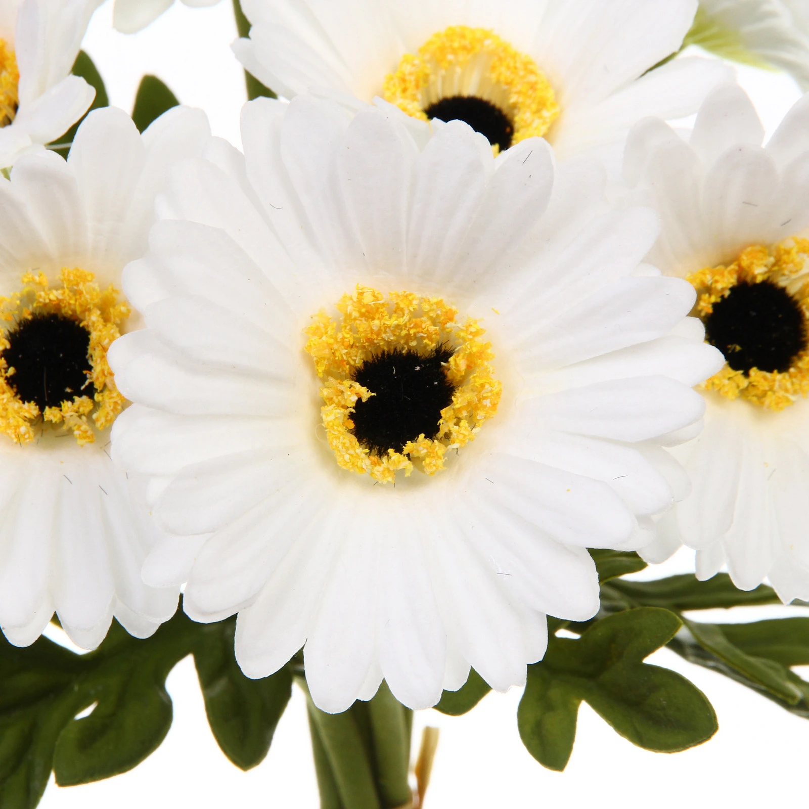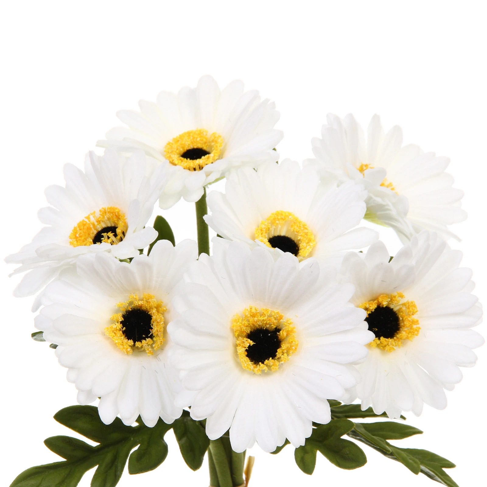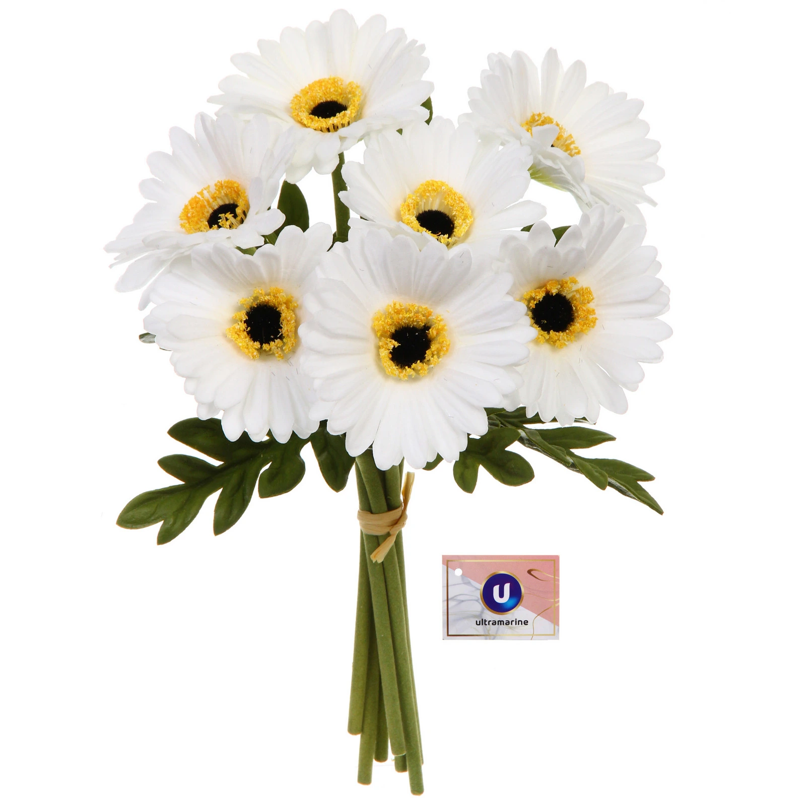 Букет состоит из 7 искусственных гербер белого цвета. Высота каждого цветка – 33 см. Материалы: пластик и силикон, обеспечивающие гибкость и прочность. Цветы поставляются собранными в пучок, готовыми к размещению в вазе.