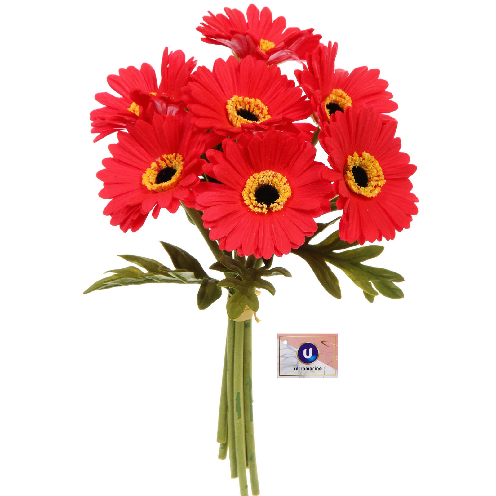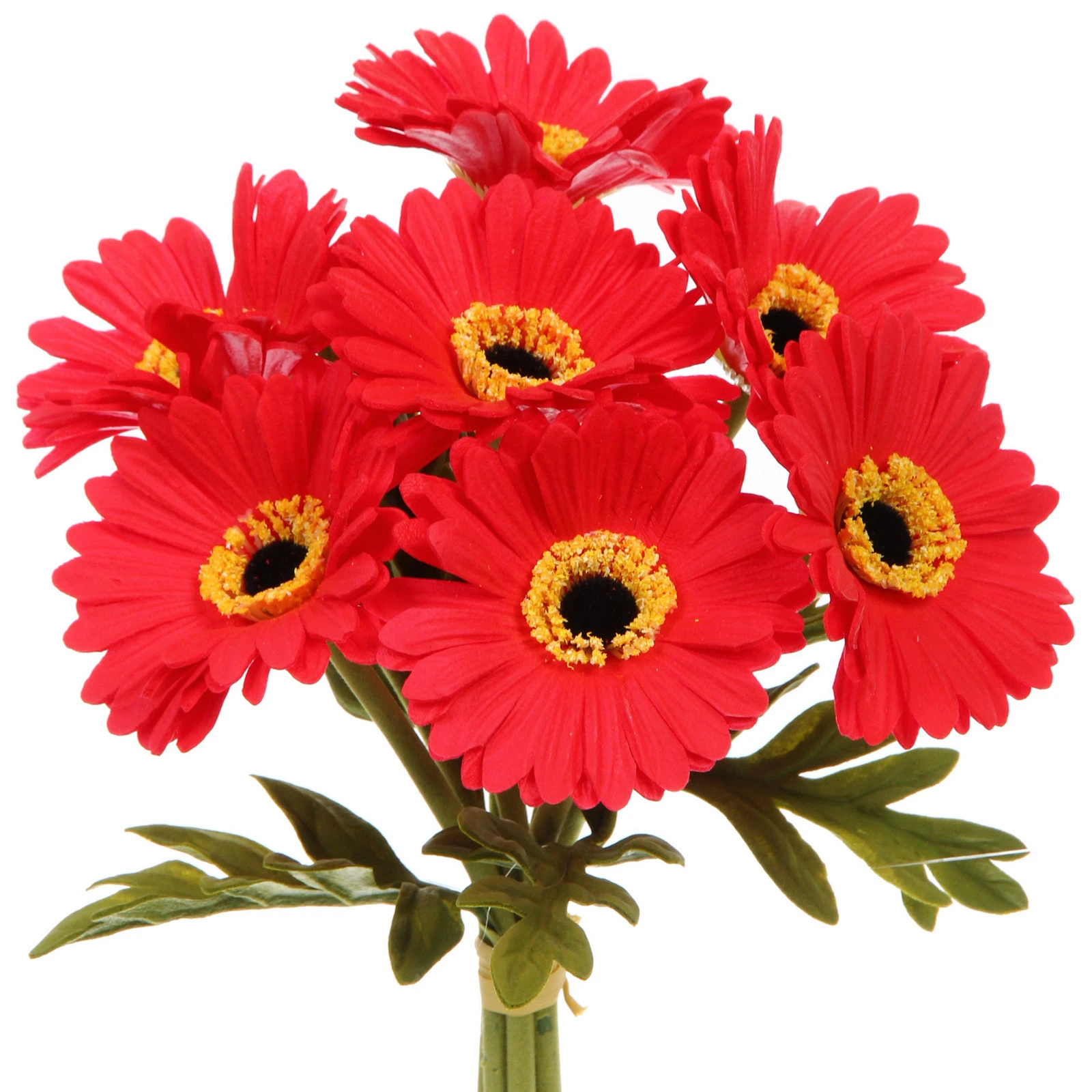 Букет состоит из 7 отдельных стеблей, что позволяет свободно формировать композицию. Каждый цветок тщательно проработан: узкие лепестки с рельефной текстурой, контрастная желто-черная сердцевина и зеленые листья с прожилками выглядят очень естественно. Стебли гибкие, их можно немного подрезать для вазы нужной высоты.