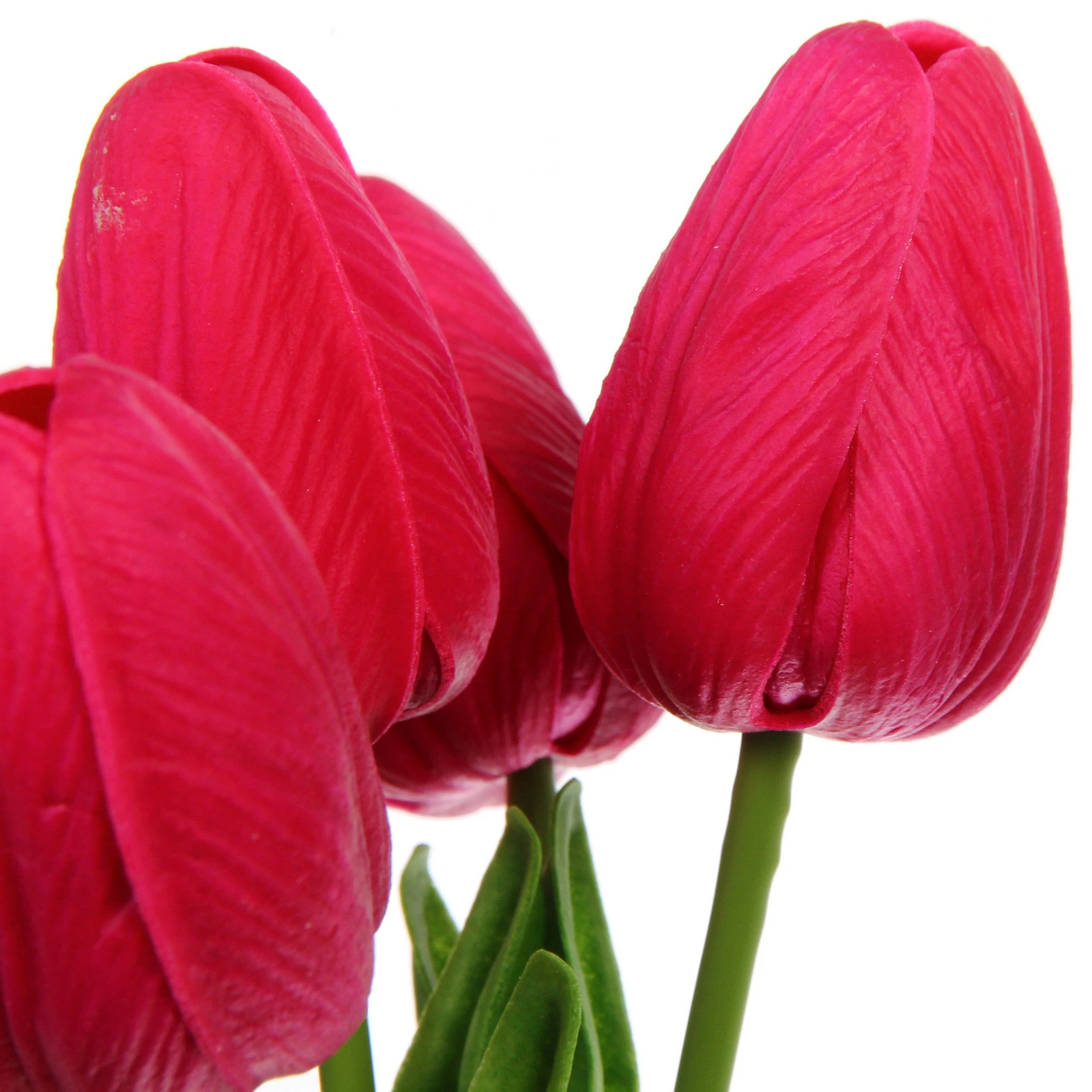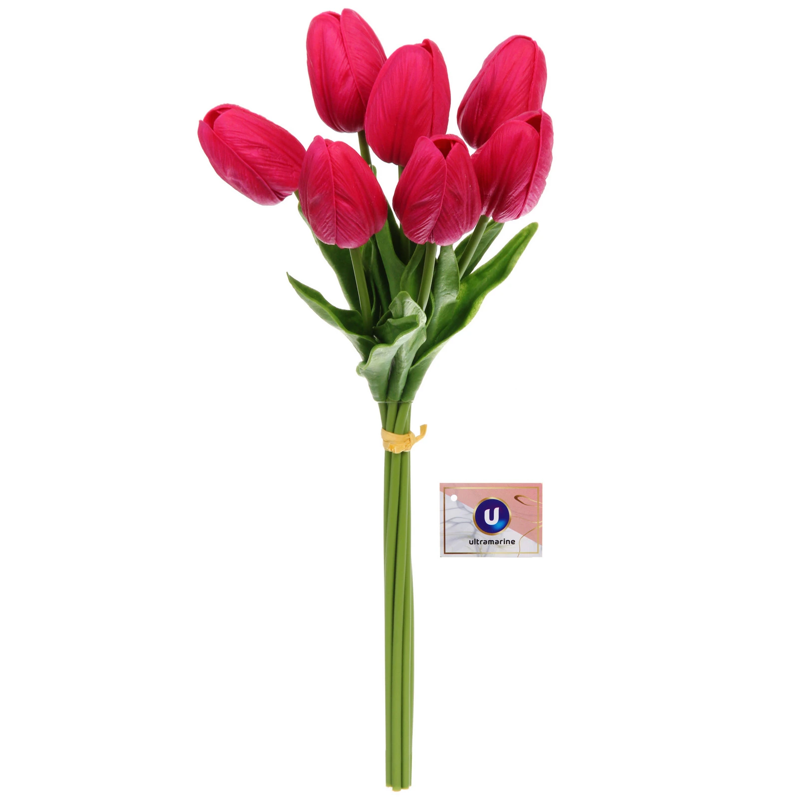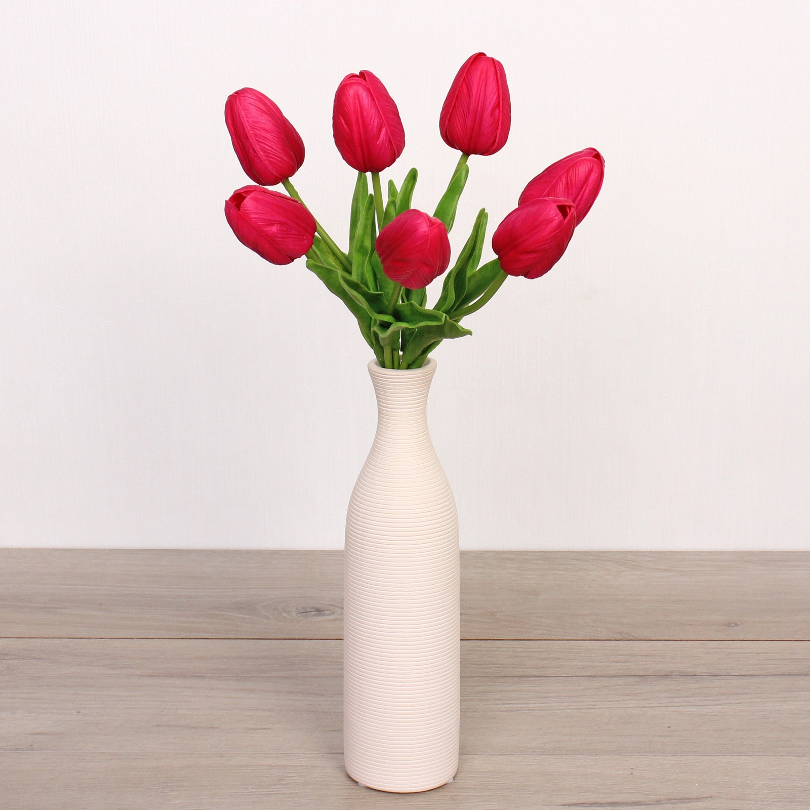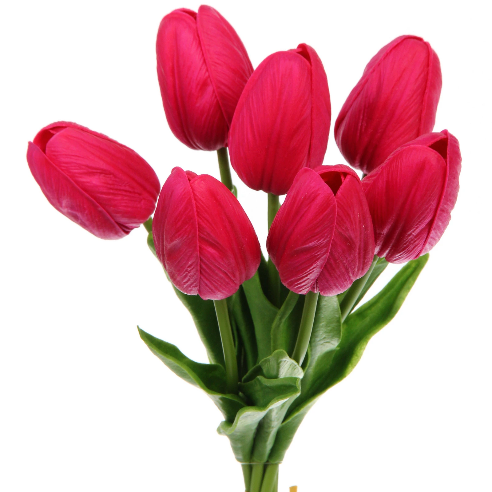 Букет состоит из семи тюльпанов с вытянутыми бутонами на прямых зеленых стеблях. У основания бутонов расположены зеленые листья, некоторые из которых естественно изогнуты, добавляя композиции динамики и натуральности. Цвет — насыщенный фиолетовый (близкий к ярко-розовому или малиновому), который отлично сочетается с нейтральными и пастельными интерьерами.