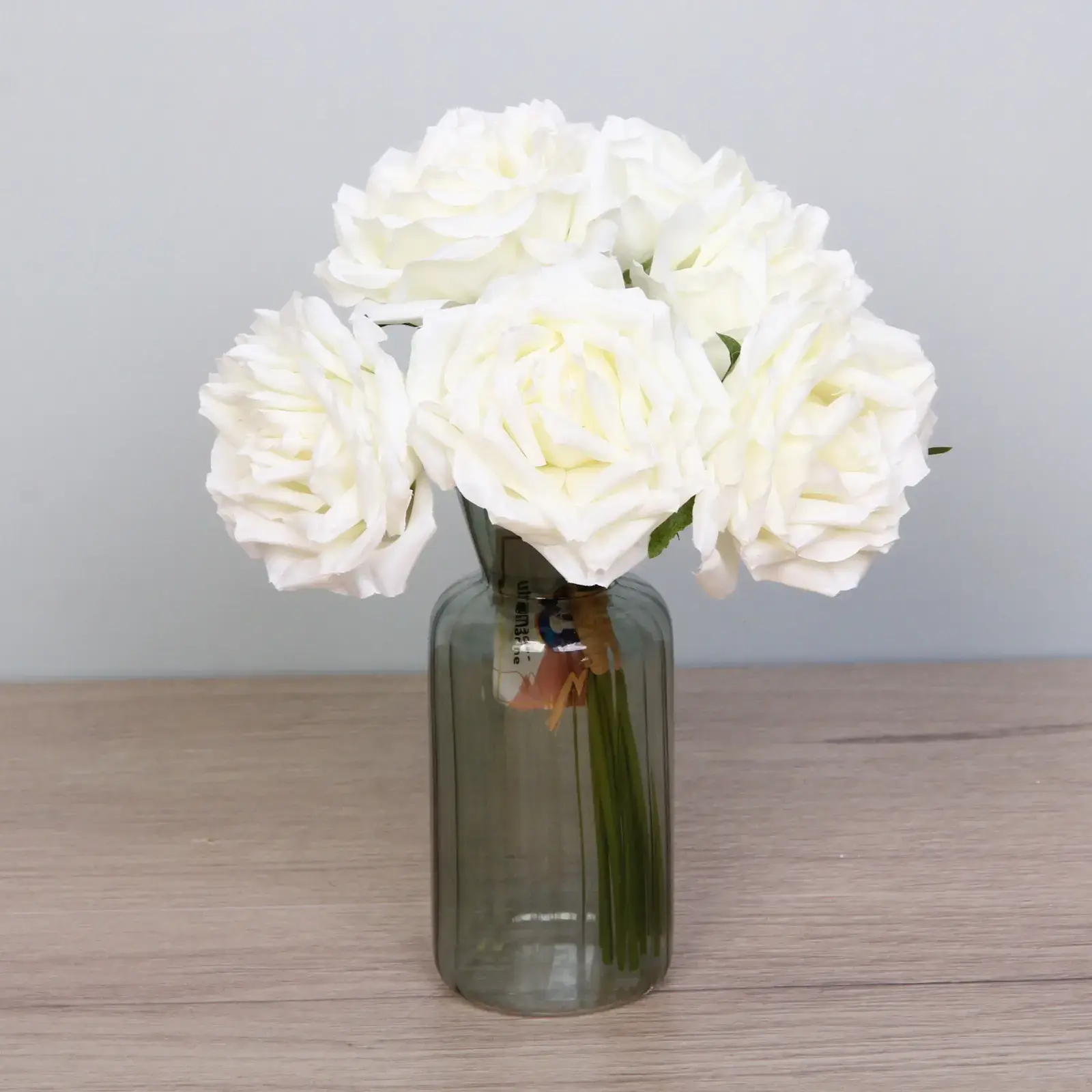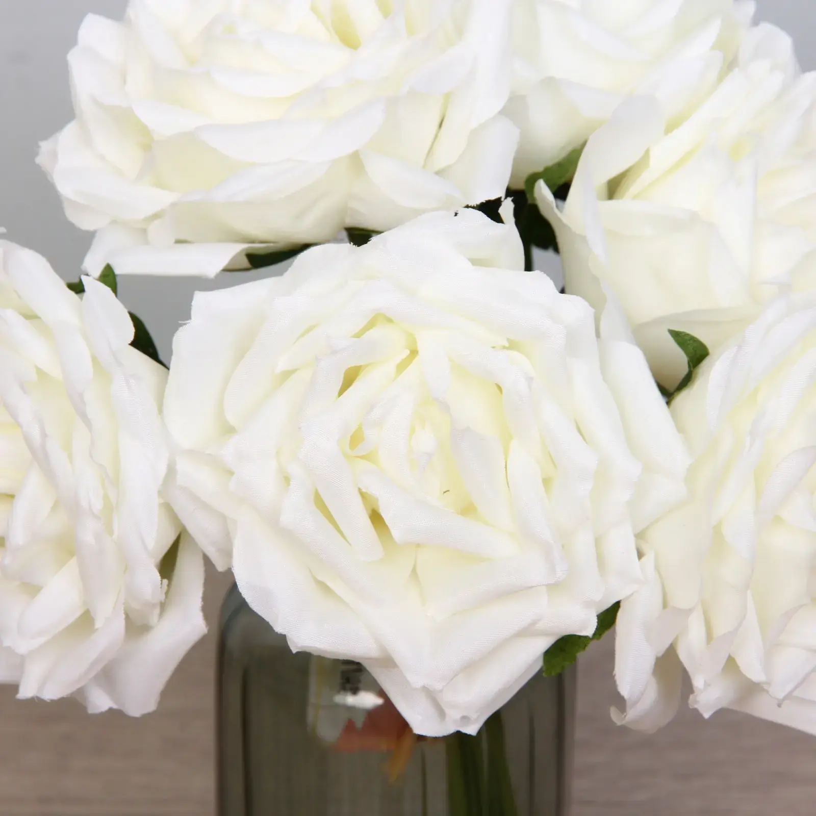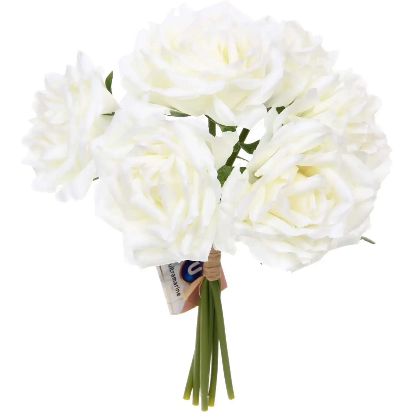 Букет состоит из 6 белых роз, выполненных из высококачественного пластика и полиэстера, что придаёт им реалистичный вид. Листья имеют насыщенный зелёный цвет, что подчеркивает естественность композиции. Размеры букета — 24 см в высоту, что делает его удобным для размещения в различных вазах и контейнерах.