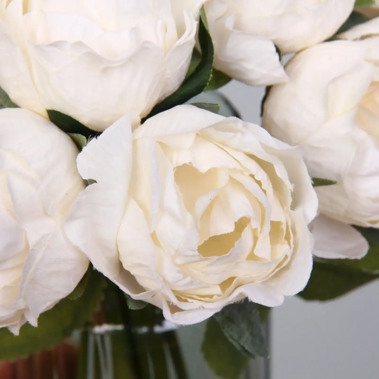 Букет выполнен из высококачественных материалов: пластика и полиэстера, что обеспечивает его долговечность и устойчивость к внешним факторам. Цветы имеют мягкий белый оттенок с легким кремовым налетом, а зелёные листья добавляют естественности. Этот букет станет не только стильным элементом декора, но и источником позитива и хорошего настроения в вашем доме.