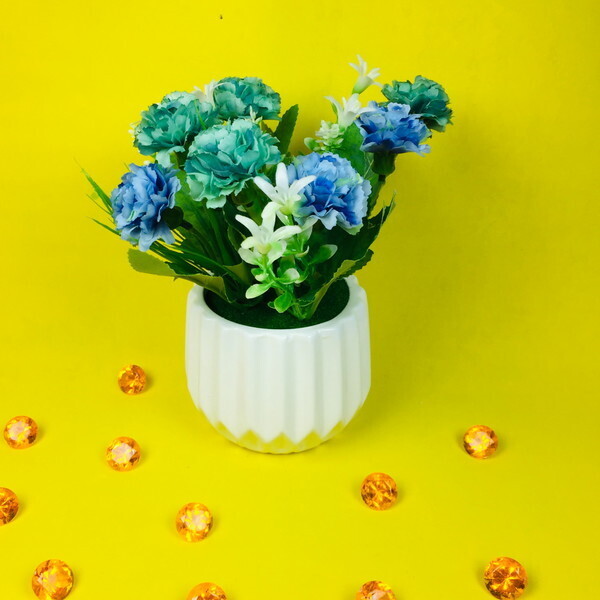 Цветы представлены в нежных оттенках голубого, белого и зеленого, что позволяет легко сочетать их с различными стилями интерьера. Белый горшок с рифленой текстурой добавляет элегантности и стиля. Размеры букета идеально подходят для настольного использования, а его компактность позволяет разместить его даже в небольших помещениях.
