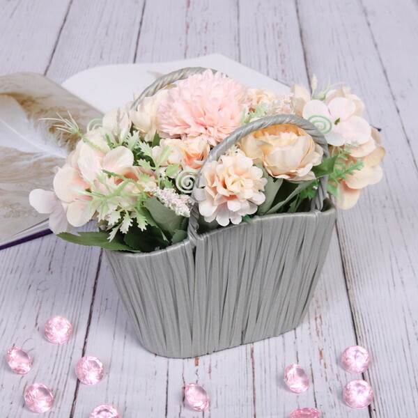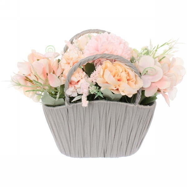 Корзина имеет прямоугольную форму и выполнена в сером цвете с рифленой текстурой. Цветы представлены в разнообразии форм и размеров, включая крупные пионы и мелкие декоративные растения. Листья окрашены в светло-зеленый цвет, что добавляет объема и естественности композиции. Размеры корзины позволяют удобно разместить ее на столе или полке, а ручки обеспечивают легкость в переноске.