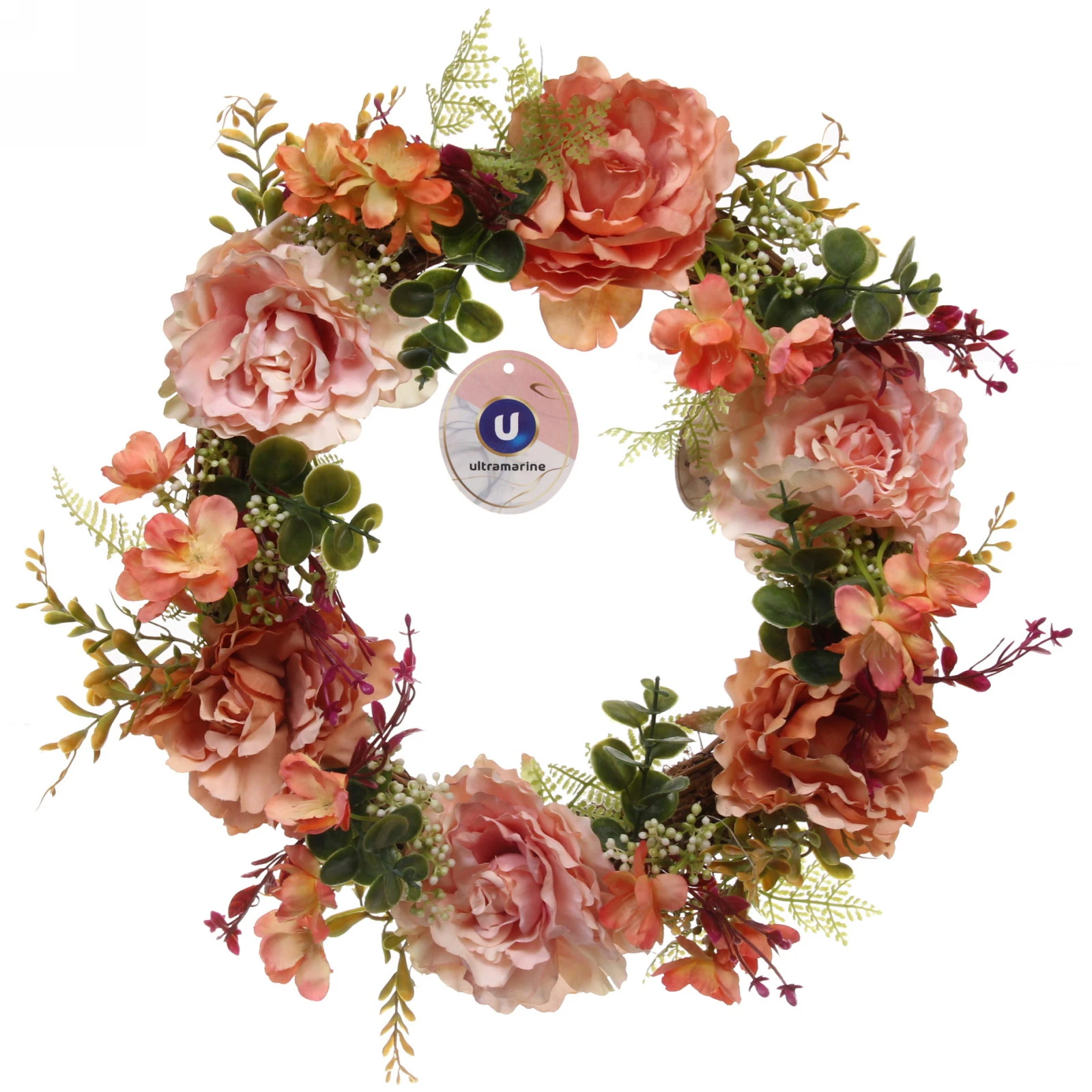 Диаметр венка составляет 42 см. Цветовая гамма представлена в ассортименте: венок может содержать различные комбинации оранжевых, персиковых и розовых оттенков в указанной палитре, что делает каждый экземпляр немного уникальным. Отгружается один венок, конкретное сочетание цветов определяется случайным образом из доступного ассортимента.