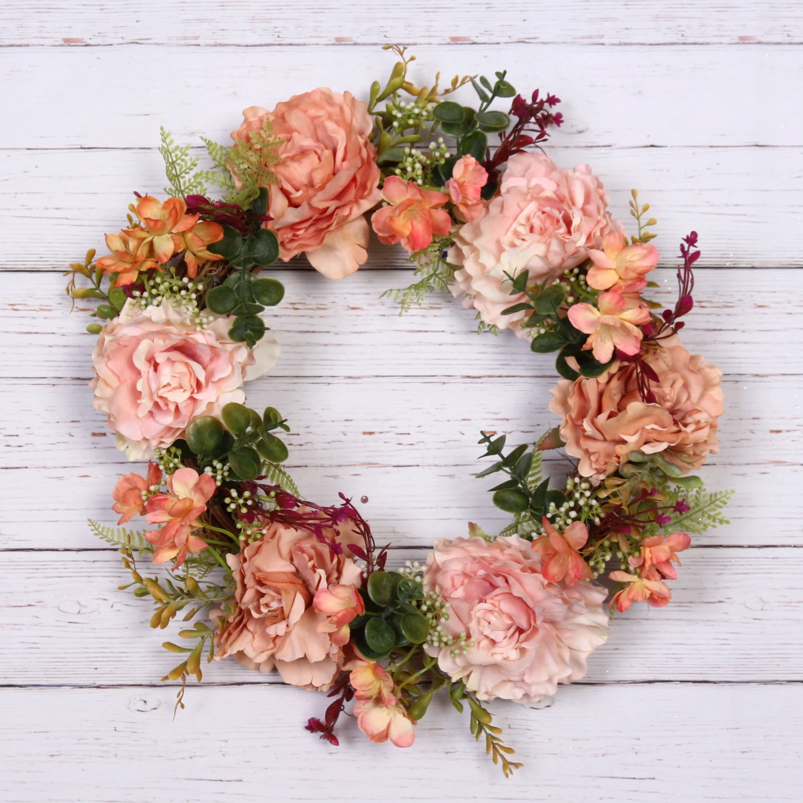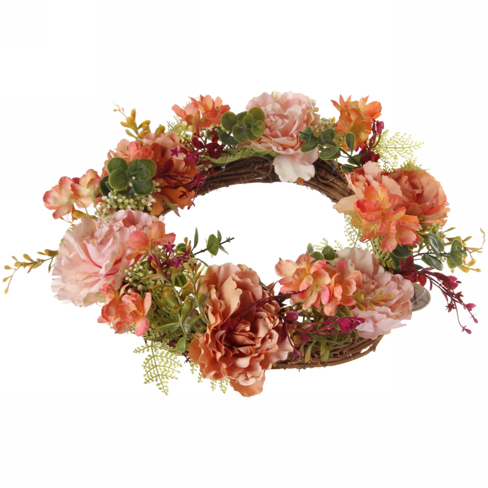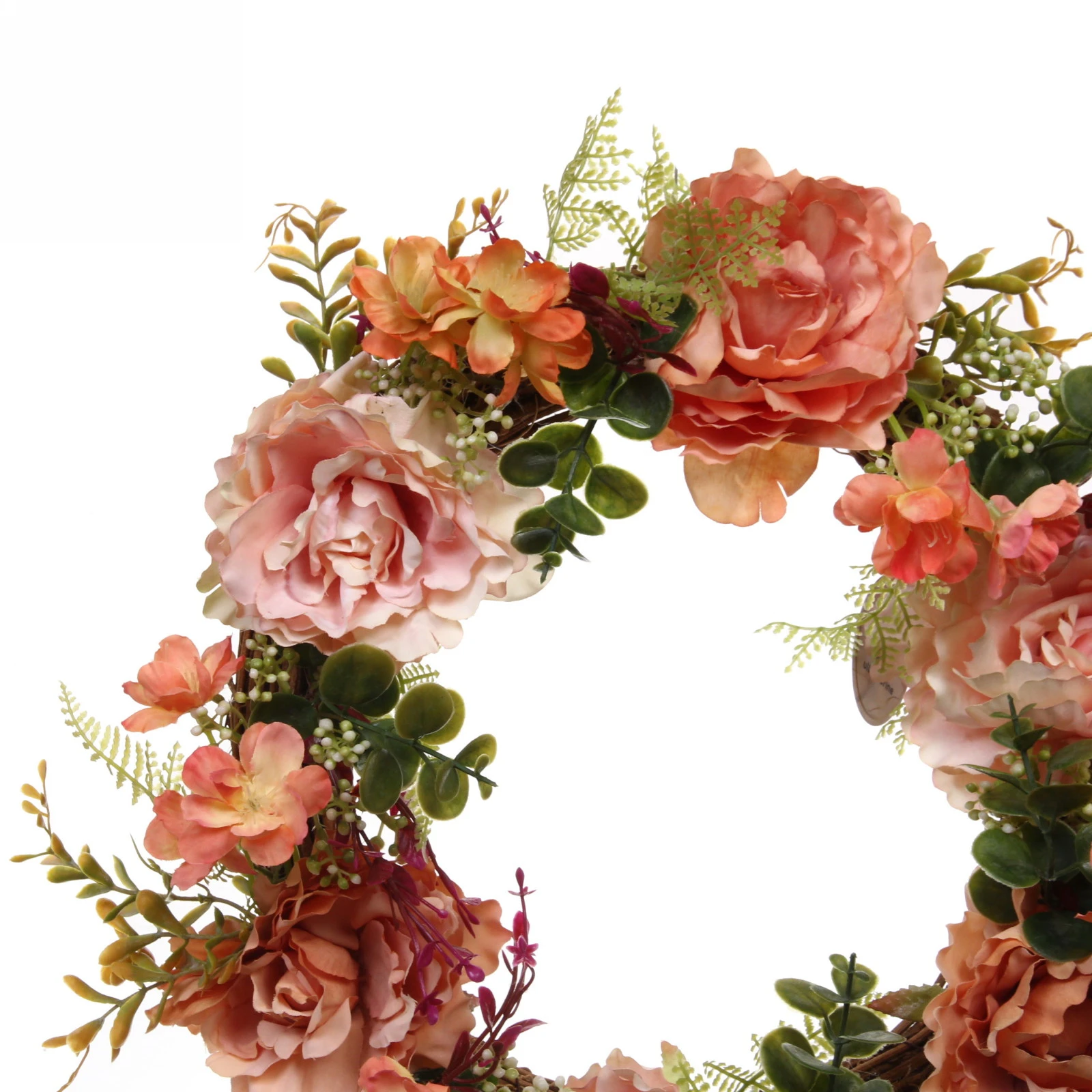 - Богатая цветовая палитра: Гармоничное сочетание оранжевых, персиковых, розовых и коралловых оттенков цветов с разнообразной зеленью листвы (от светлой до насыщенной) делает венок самодостаточным и ярким.