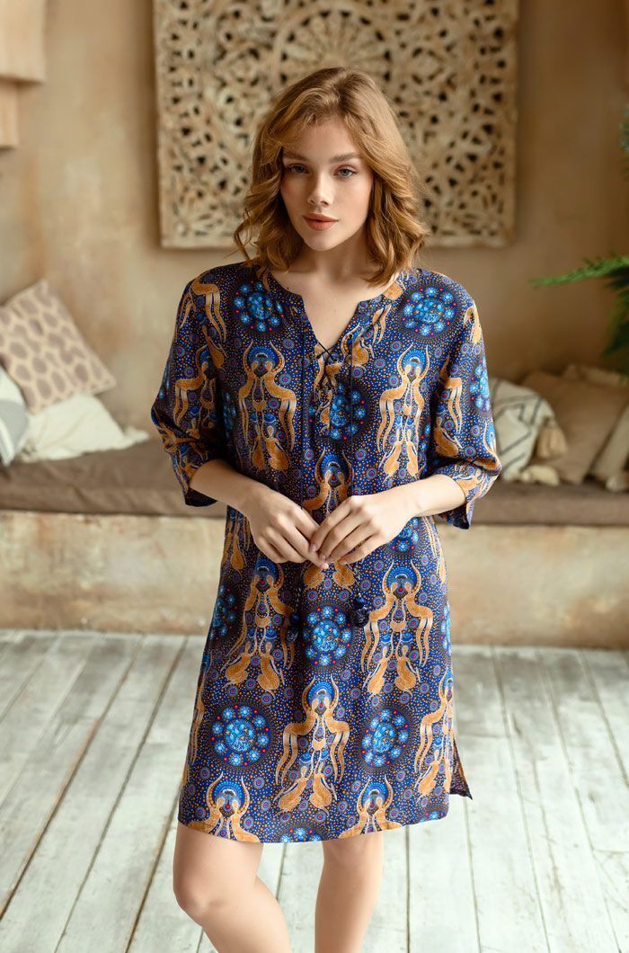 Универсальная длина середины бедра позволяет носить тунику как самостоятельный элемент с леггинсами или джинсами, либо как удлинённую блузу с юбкой. Разноцветный принт в сине-золотистой гамме легко комбинируется с базовыми оттенками в гардеробе.