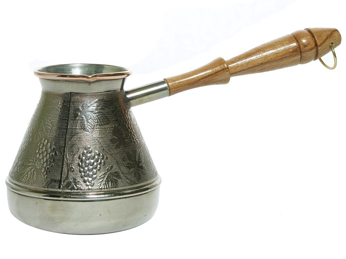 Медная турка с никелированным внутренним покрытием сохраняет натуральный вкус напитка, предотвращая окисление. Декоративный виноградный орнамент добавляет изысканности вашему кофейному ритуалу.