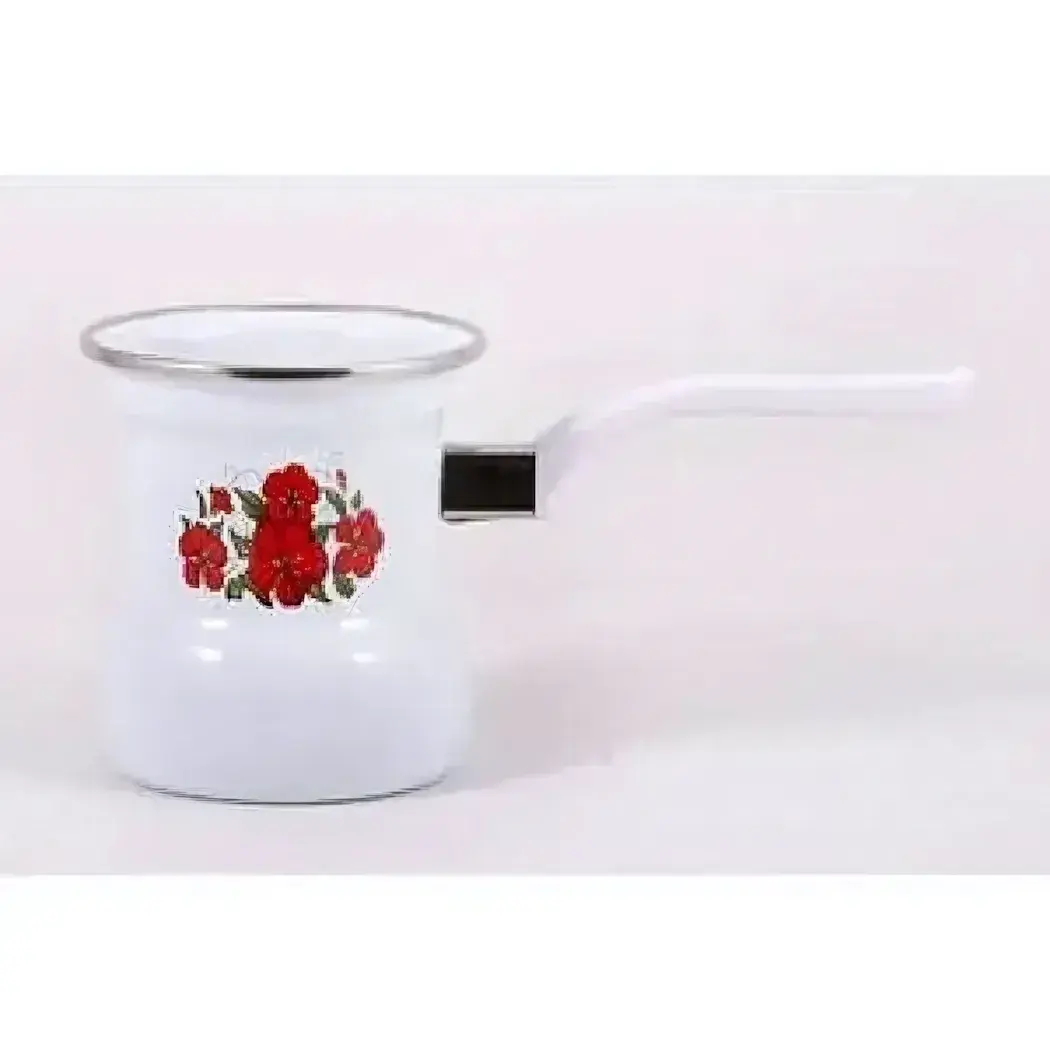 Турка эмалированная 0,4л для кофе, белая с красными цветами, черная ручка, защита от окисления