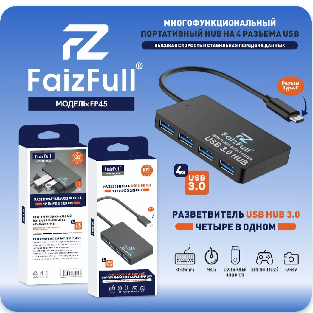 USB-хаб FaizFull "FP45", 4 порта USB 3.0, компактный дизайн, черный цвет