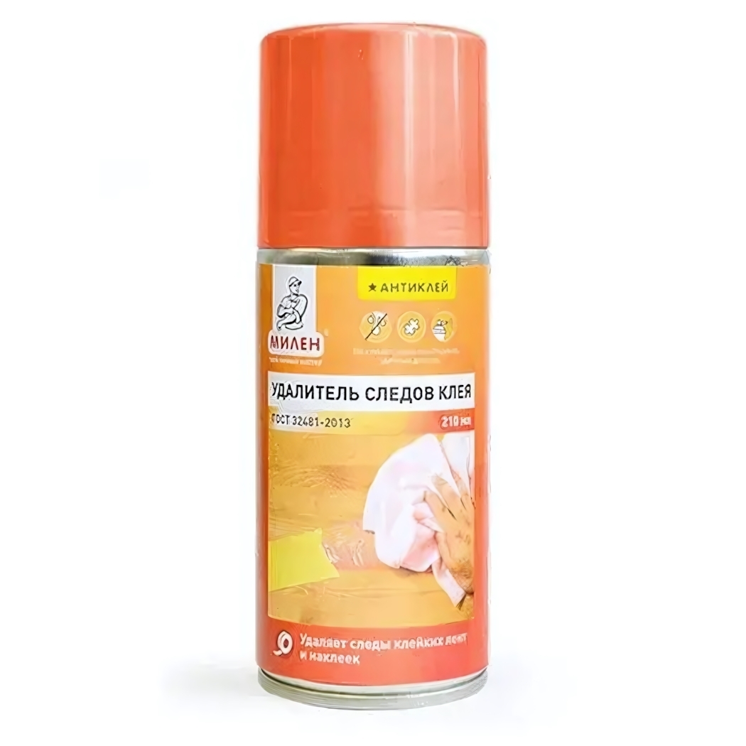 Произведено в России под контролем бренда Милен. Подходит для удаления следов от скотча, этикеток, строительных клеев и резиновых аппликаций. Рекомендуем использовать в проветриваемых помещениях с последующим удалением остатков средства сухой тканью.