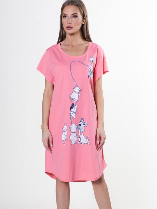 Сорочка выполнена в свободном удлиненном крое, который мягко облегает фигуру, не сковывая движений. Короткие рукава и округлый вырез горловины обеспечивают дополнительную вентиляцию и удобство. Длина до колен делает эту модель особенно практичной — она не задирается и не стесняет вас во время домашних дел или отдыха на диване.