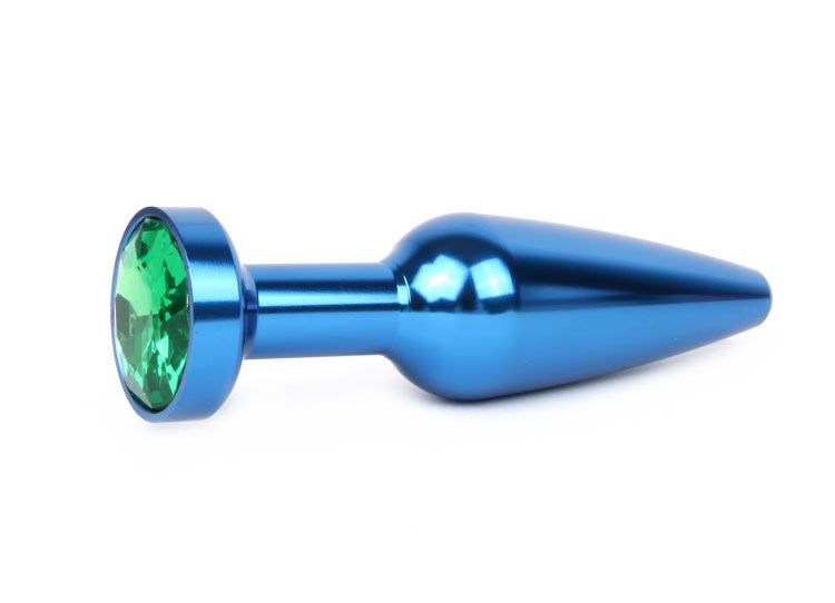 Удлиненная коническая втулка из металла сочетает в себе эстетику ювелирного украшения и функциональность интимной игрушки. Гладкая синяя поверхность и изящная зеленая кристалльная вставка в основании создают притягательный визуальный образ, превращая процесс в элегантную игру.