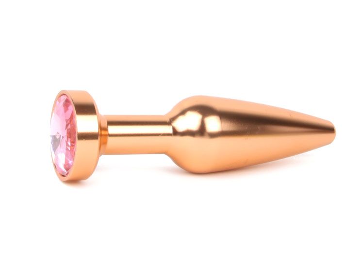 Золотистый оттенок основного тела втулки выглядит роскошно и благородно. На плоском основании закреплена декоративная вставка в виде ограненного кристалла розового цвета, которая красиво переливается при свете. Этот элемент превращает интимный аксессуар в изящное украшение.
