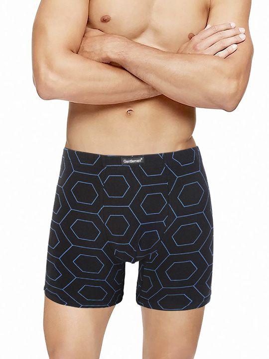 Черные трусы-боксеры 'Gentlemen' с геометрическим узором из шестиугольников в синем цвете — это идеальное сочетание практичности и современного дизайна. Благодаря удлиненному крою они обеспечивают максимальный комфорт в течение дня.