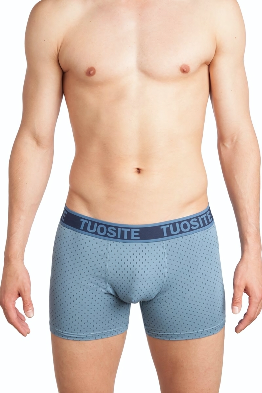 Цвет боксеров – голубой с мелким узором, что придаёт им современный вид. Резинка шириной 3 см обеспечивает надежную фиксацию, не сжимая кожу. Эти трусы-боксеры станут отличным дополнением к вашему гардеробу и подарят вам уверенность в любой ситуации.