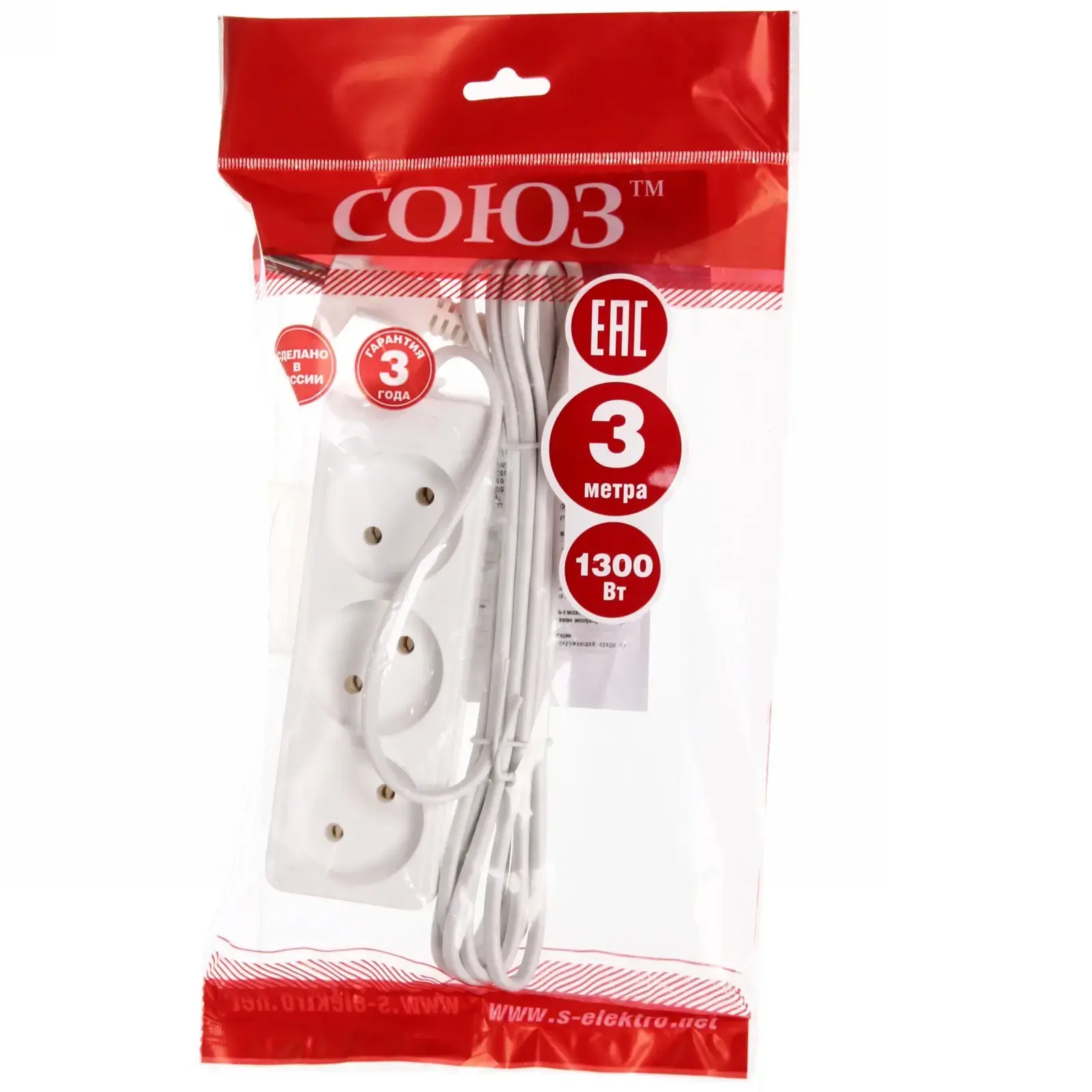 Удлинитель «Союз» 3 гнезда, 3м, ШВВП 2x0.75мм², 1300Вт, белый, без заземления