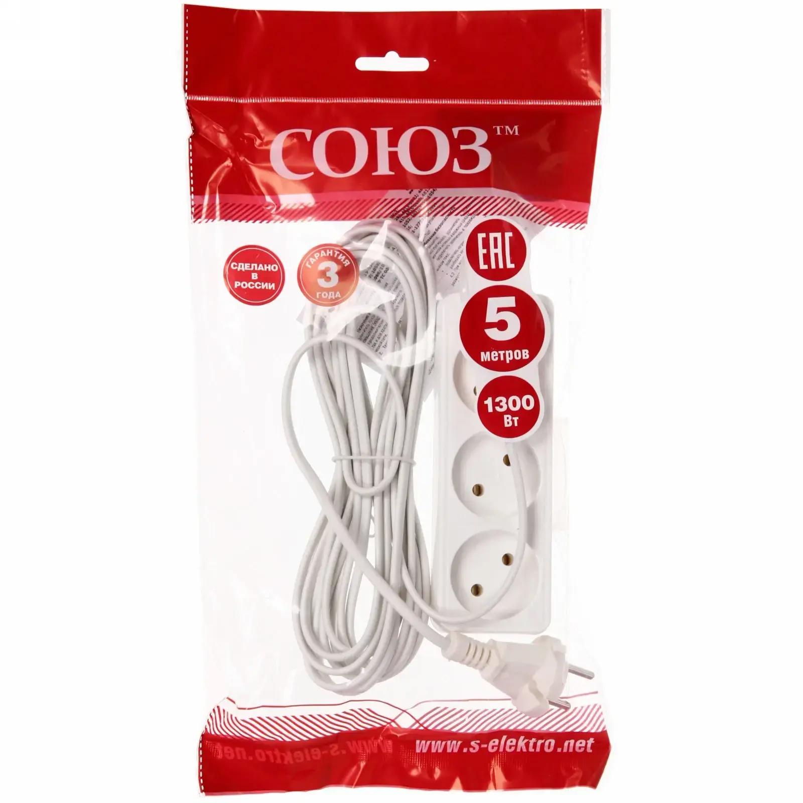 Удлинитель 'Союз' с тремя гнездами и длиной 5 метров обеспечит вам комфорт и удобство в использовании электрических приборов. Благодаря максимальной мощности в 1300 Вт, вы сможете подключать несколько устройств одновременно, не беспокоясь о перегрузках. Этот удлинитель идеально подходит для дома, офиса или дачи, где требуется подключение нескольких электроприборов.