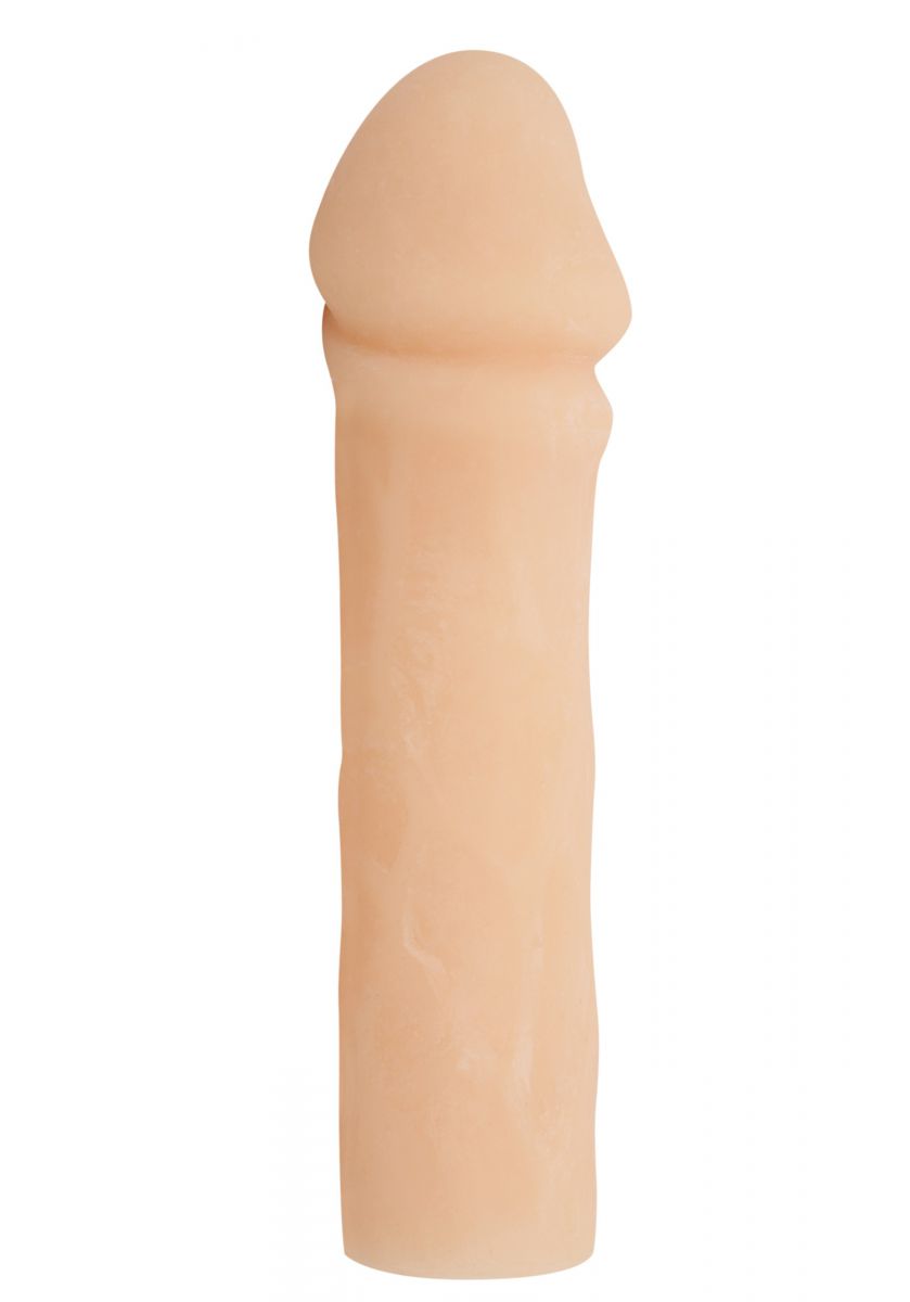 Изделие выполнено в анатомической форме с реалистичной текстурой и телесным оттенком, что обеспечивает естественный внешний вид. Мягкий и тянущийся материал плотно облегает, словно вторая кожа, подстраиваясь под индивидуальные особенности. Насадка увеличивает длину до 7 см и добавляет до 2 см в объеме, при общей длине 18 см.
