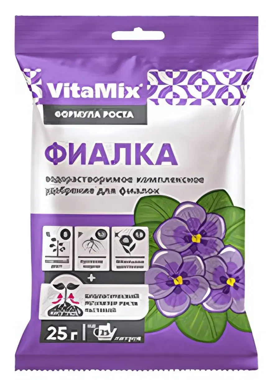 Удобрение упаковано в компактный пакет весом 25 г, что делает его удобным для хранения и использования. На упаковке представлены символы, иллюстрирующие основные рекомендации по уходу за растениями, что поможет вам правильно применять продукт. Не упустите возможность сделать ваши фиалки более красивыми и здоровыми с помощью удобрения VitaMix!