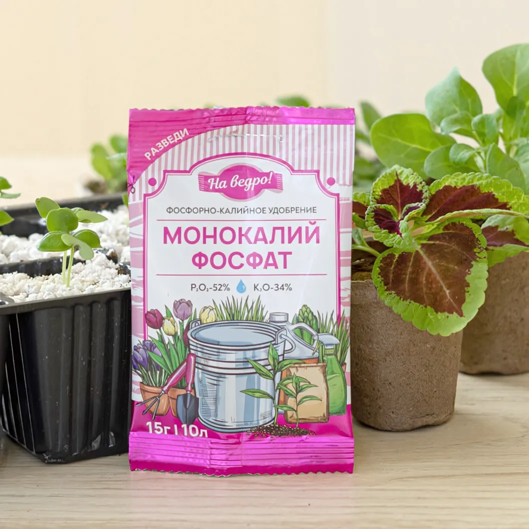 Удобрение упаковано в компактный пакет весом 15 г, что делает его удобным для хранения и транспортировки. Яркий дизайн упаковки с цветочными иллюстрациями не только привлекает внимание, но и подчеркивает его назначение. Используйте удобрение Монокалийфосфат для достижения великолепных результатов в вашем саду!