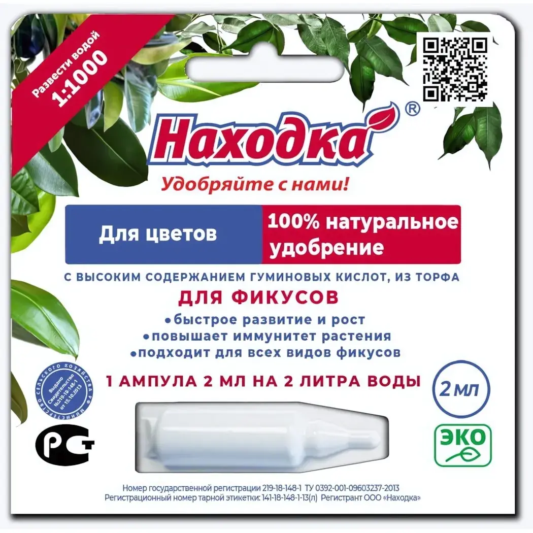 Упаковка удобрения выполнена в виде ампулы объемом 2 гр., что позволяет точно дозировать необходимое количество. Удобная форма упаковки и яркий дизайн делают его заметным на полке. Удобрение «Находка» — это ваш надежный помощник в уходе за фикусами, который обеспечит им все необходимые питательные вещества для здорового роста и цветения.