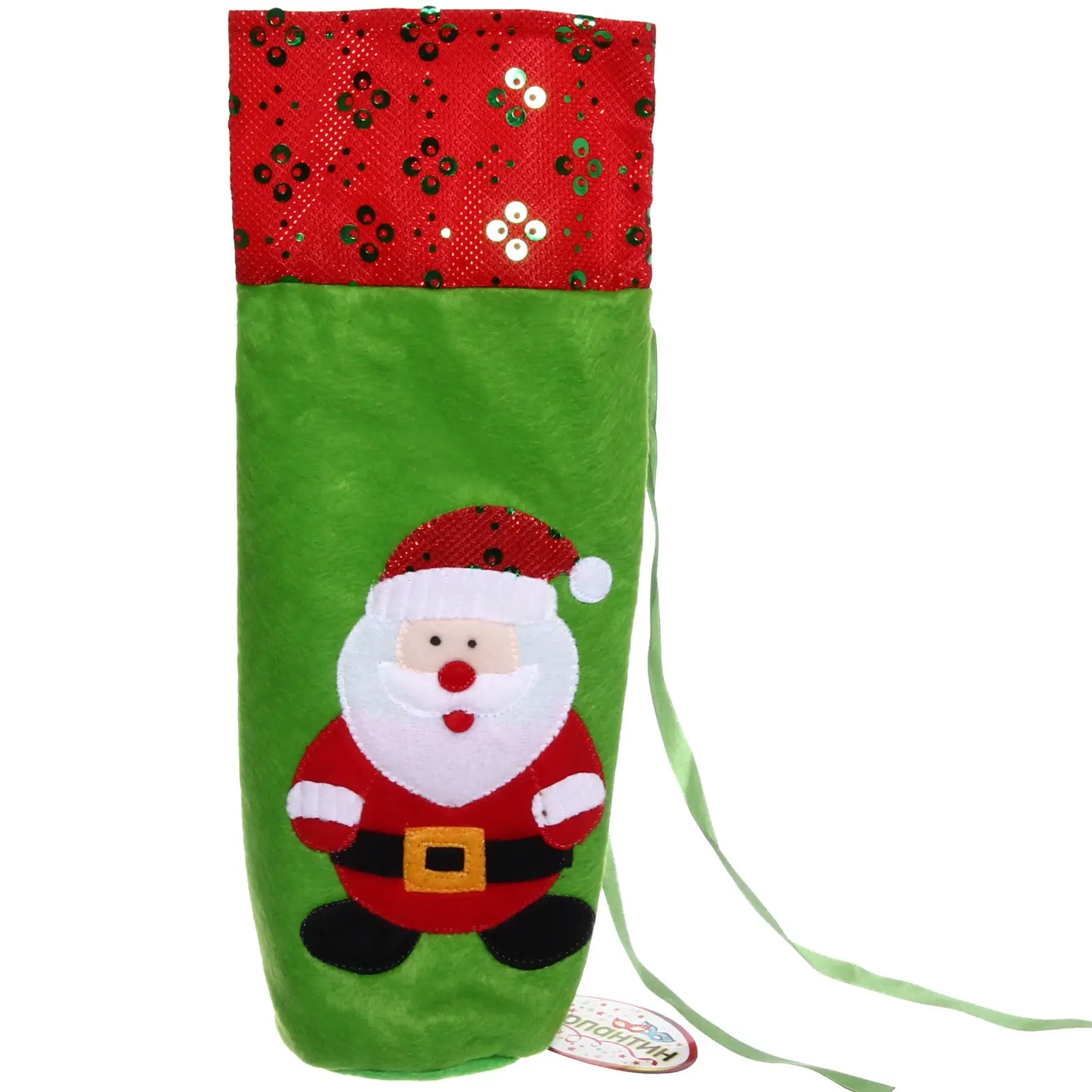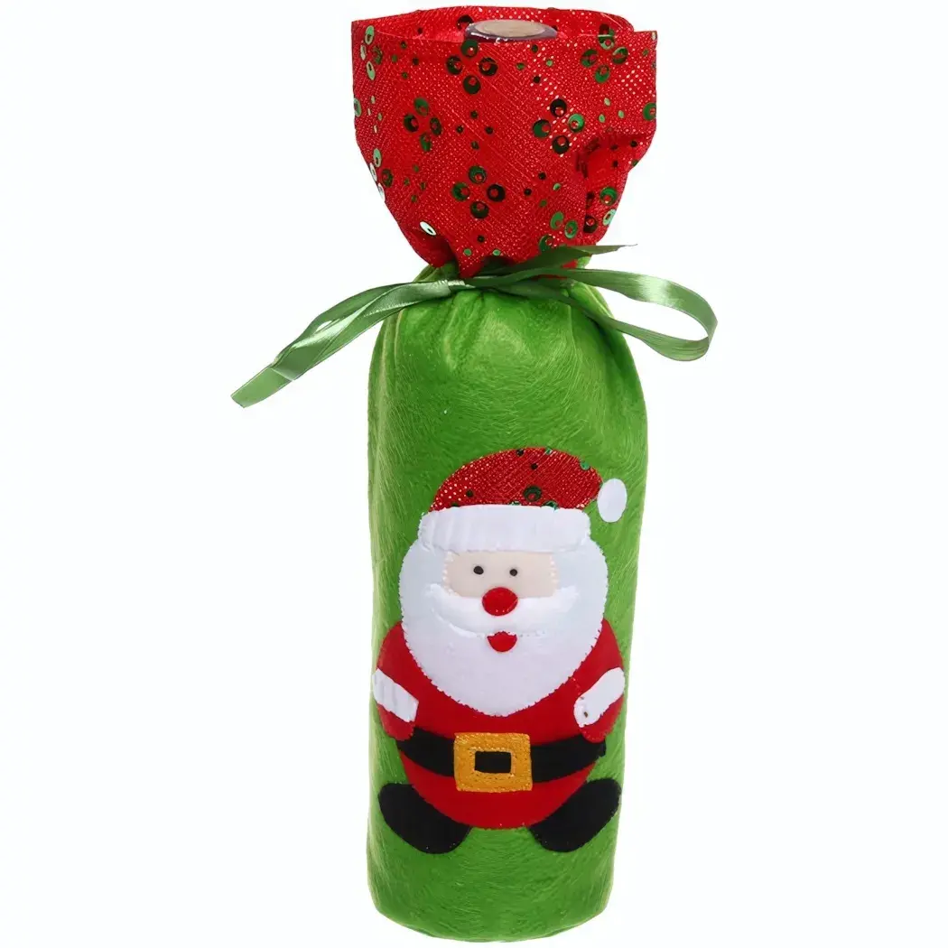 Подарите своей бутылке атмосферу праздника с уникальным тканевым украшением «Новогодние друзья». Яркий зелёный фон, красные акценты и милый Санта‑Клаус создают ощущение настоящего новогоднего чуда, которое радует глаз и поднимает настроение.