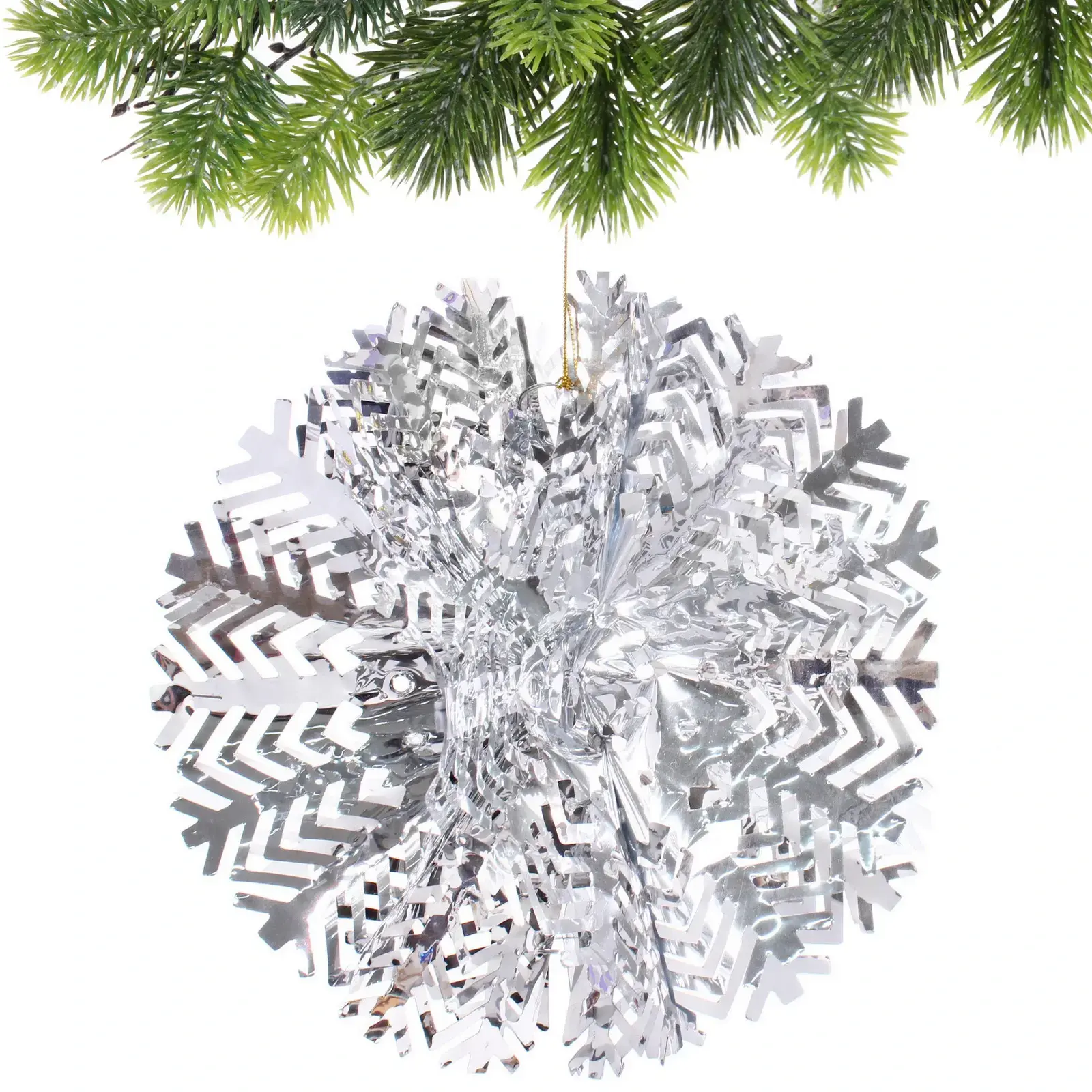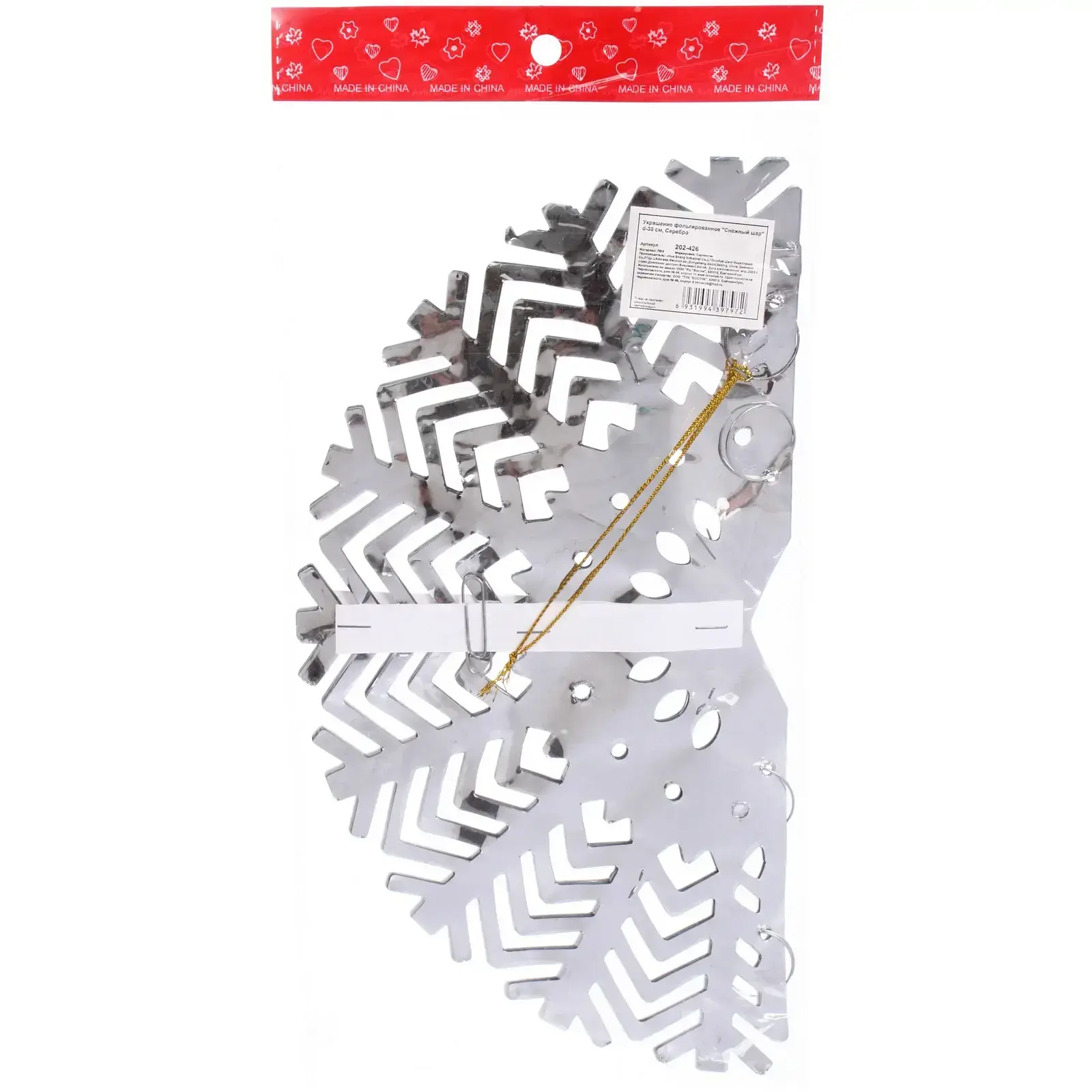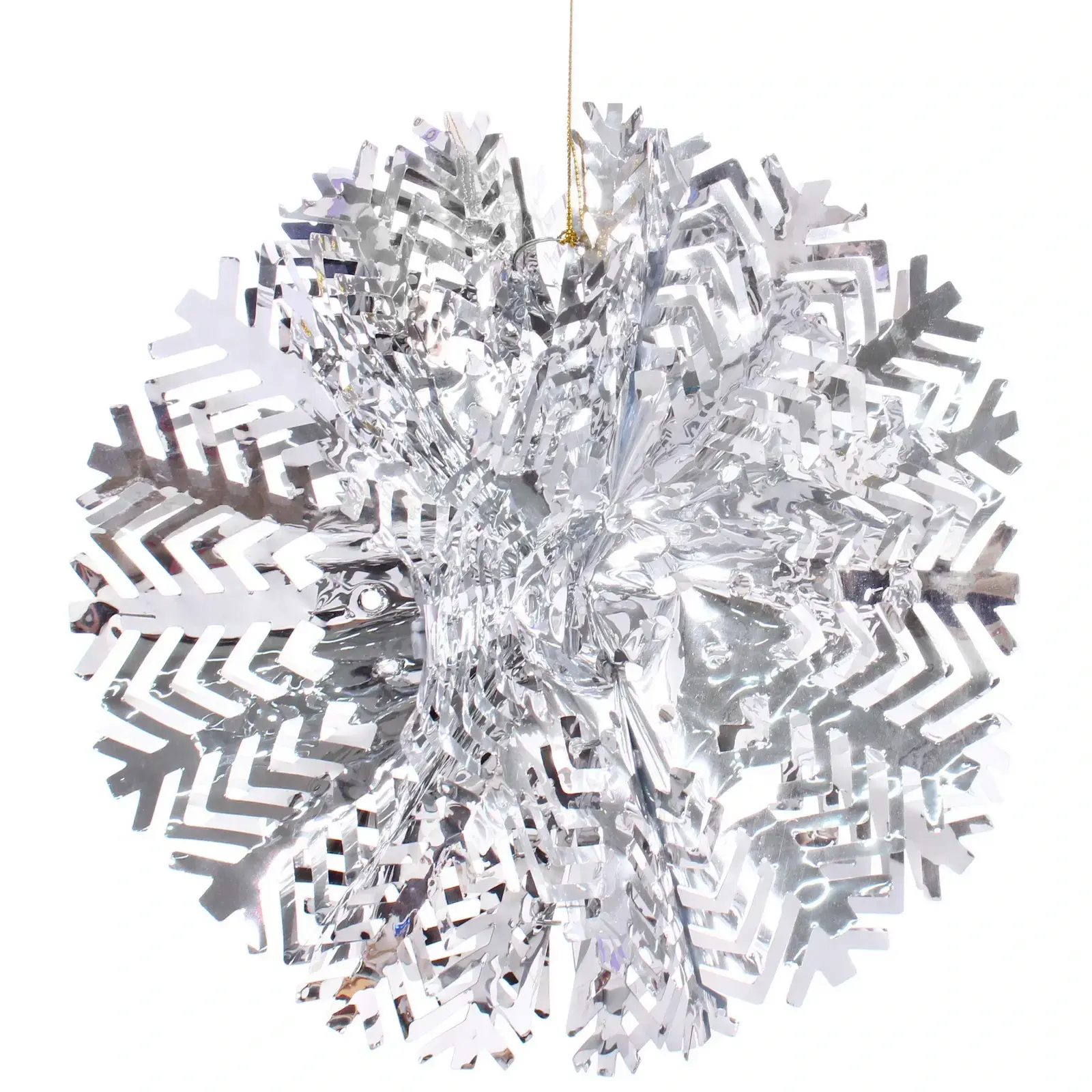 Фольгированное украшение в форме снежного шара диаметром 30 см станет идеальным дополнением к вашему новогоднему декору. Его блестящая серебристая поверхность отражает свет, создавая эффект мерцания и добавляя праздничного настроения в ваш дом. Это украшение не только красиво, но и практично — оно легко подвешивается благодаря золотистой петле, что позволяет вам разместить его в любом удобном месте.