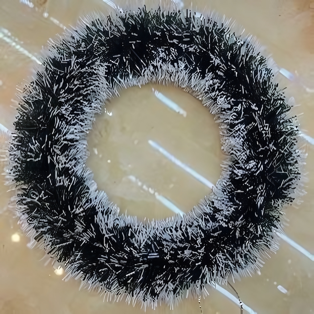 Размер венка составляет 30 см в диаметре, что делает его компактным и удобным для размещения. Черный цвет с белыми вставками выполнен из тонких волокон, создающих декоративный эффект, который привлекает внимание и создает атмосферу праздника. 'Волшебный венок' станет отличным дополнением к вашему новогоднему декору и подарит вам и вашим близким радость и уют в праздничные дни.