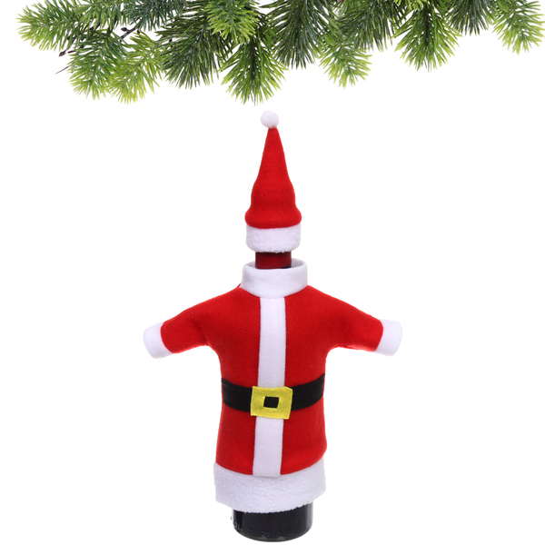 Размеры и точные параметры товара не указаны, но украшение подходит для стандартных бутылок. Оно выполнено в классических новогодних цветах: красном, белом и черном, что делает его универсальным для любого стиля оформления. Пояс с золотой пряжкой добавляет изюминку и завершает образ.