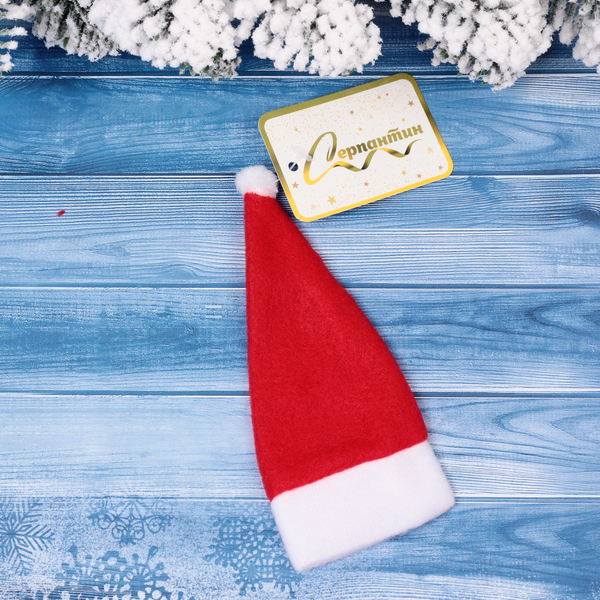 Размеры украшения составляют 6х12 см, что делает его универсальным для большинства стандартных бутылок. Красный цвет с белым отворотом и помпоном придает ему праздничный вид, а текстильный материал обеспечивает мягкость и комфорт. Это украшение станет отличным подарком для друзей и близких, а также прекрасным дополнением к вашему новогоднему декору.