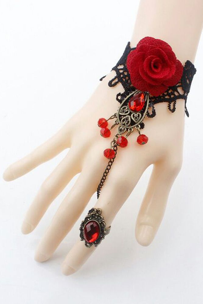 Украшение выполнено из комбинации материалов: полиэстер (кружево и текстильные элементы), металл (цепочки, кольцо, подвеска) и декоративные элементы (камни, бусины). Цветовая гамма – сочетание черного, красного и золотистого/бронзового оттенков. Такой аксессуар не требует специального ухода – достаточно бережного хранения и защиты от сильных механических воздействий.