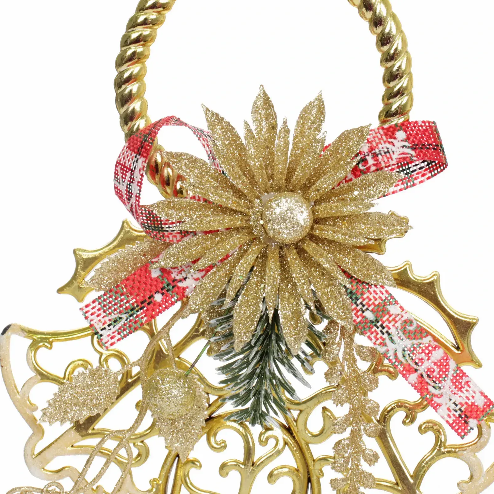 Это изделие выполнено из качественного пластика, что обеспечивает его долговечность и устойчивость к повреждениям. Золотистый цвет и блестящие детали придают ему особый шарм, а аккуратная форма и витиеватые узоры делают его по-настоящему уникальным. Кроме того, украшение легко подвешивается благодаря удобной ручке, что позволяет вам быстро и просто разместить его в любом месте.