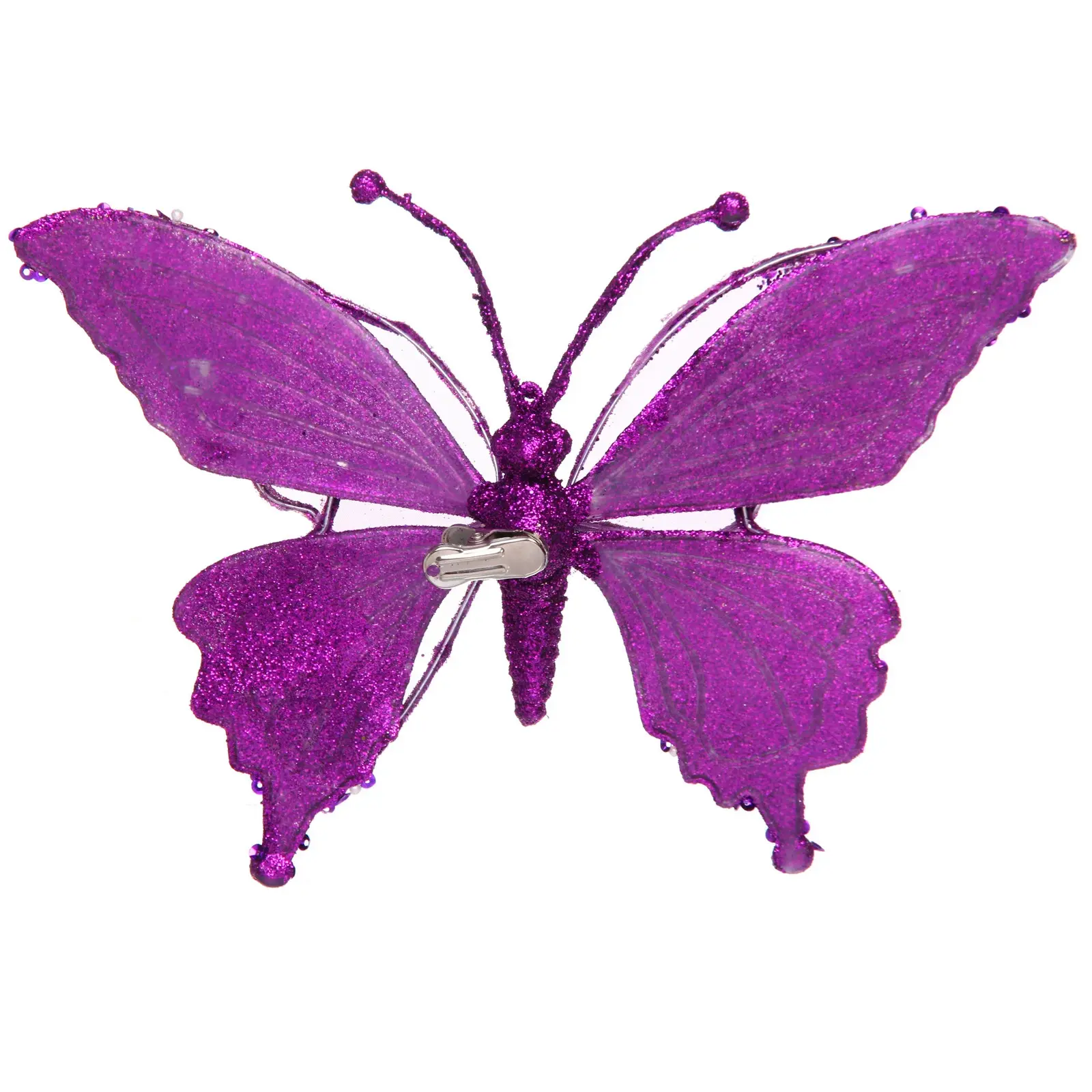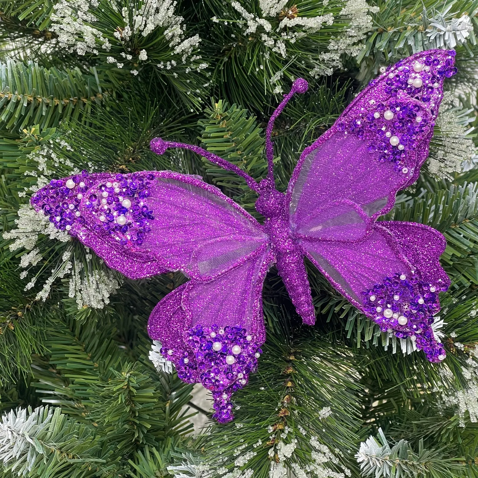 Добавьте утончённости и блеска вашей новогодней ёлке или праздничной композиции с помощью декоративной бабочки в изысканном фиолетовом оттенке. Глиттерное покрытие крыльев и корпуса создает мерцающий эффект, который прекрасно отражает свет гирлянд, наполняя интерьер атмосферой роскоши.