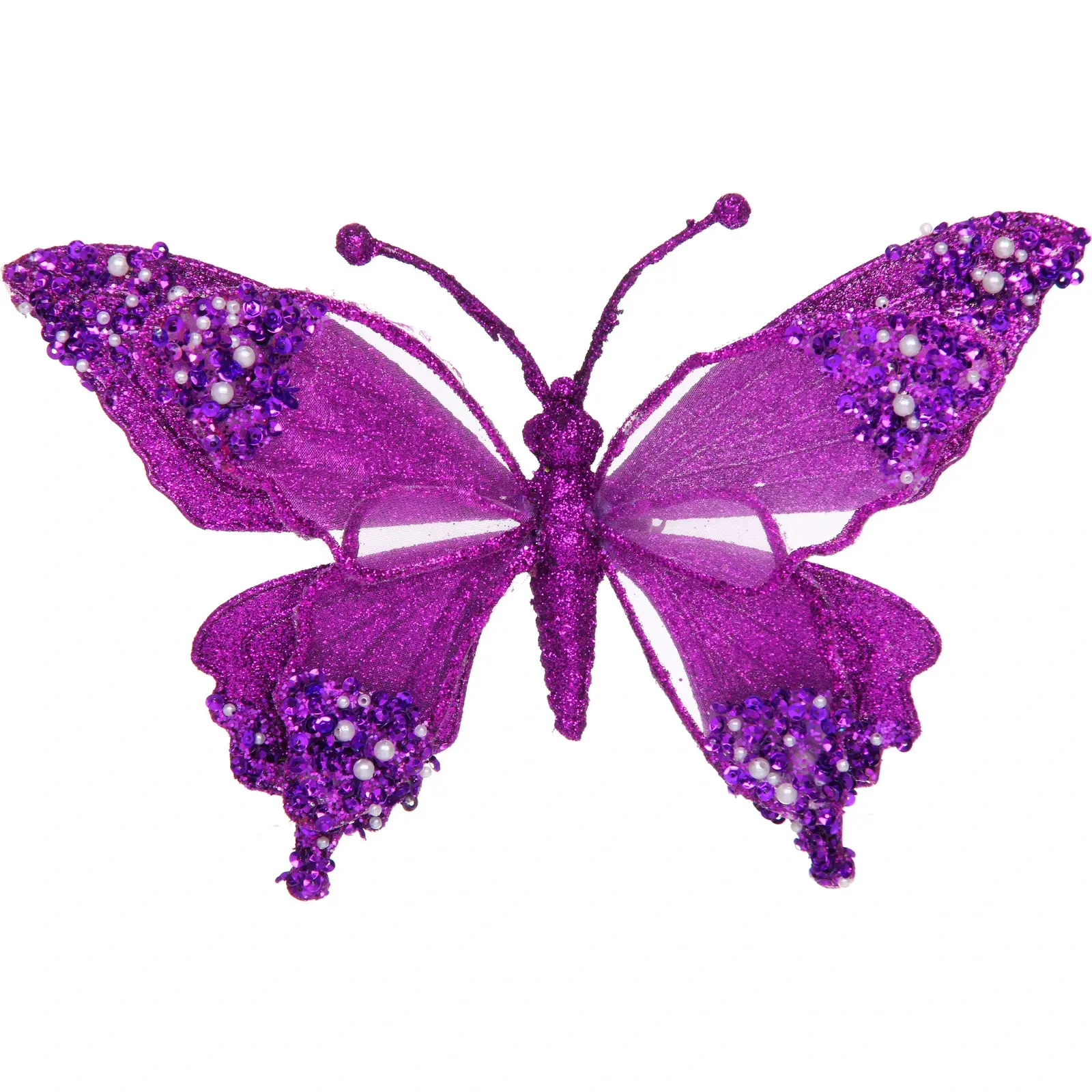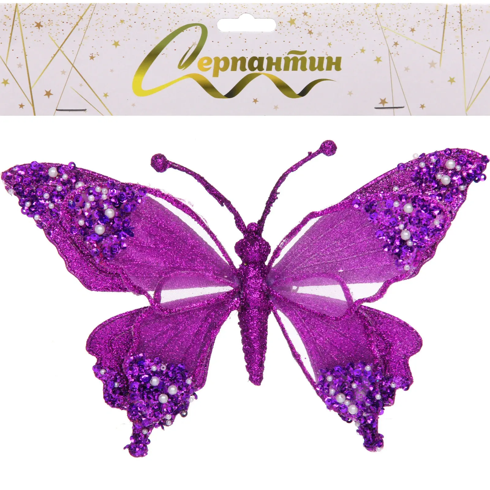 Размер: 24.5×9×17 см. Материал: текстиль с глиттерным покрытием, декоративные элементы из пластика и бусин. Отгружается один товар, цвет определяется как фиолетовый. Бабочка красиво дополнит стильную елочную коллекцию и станет ярким акцентом в вашем праздничном декоре.