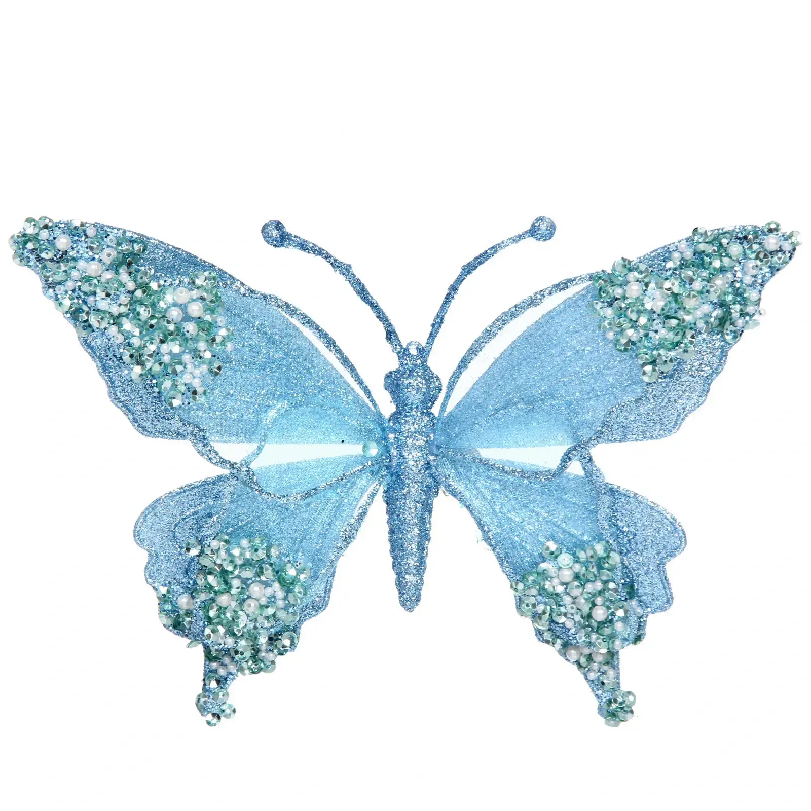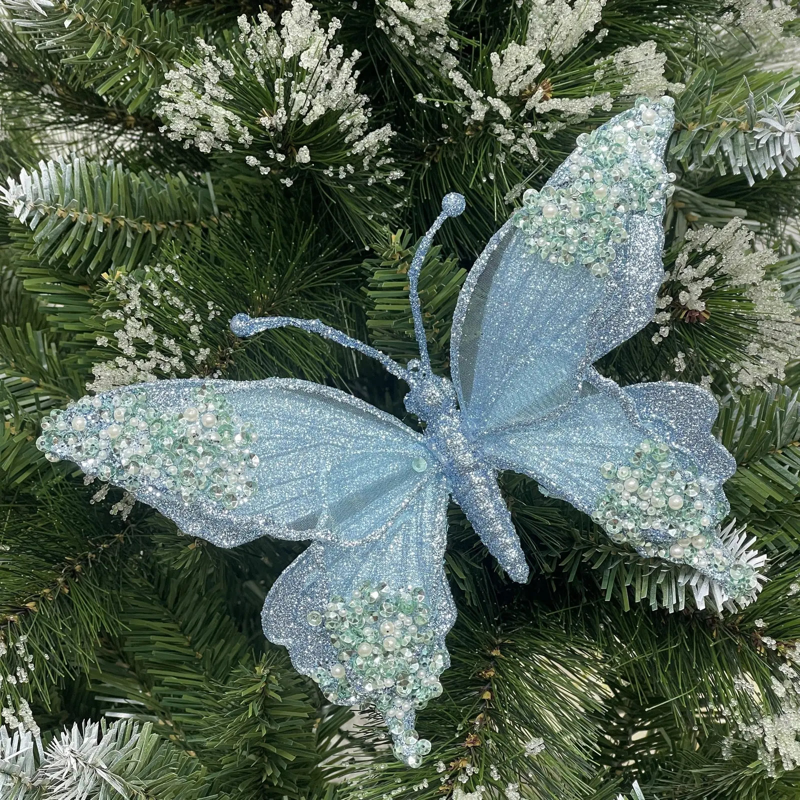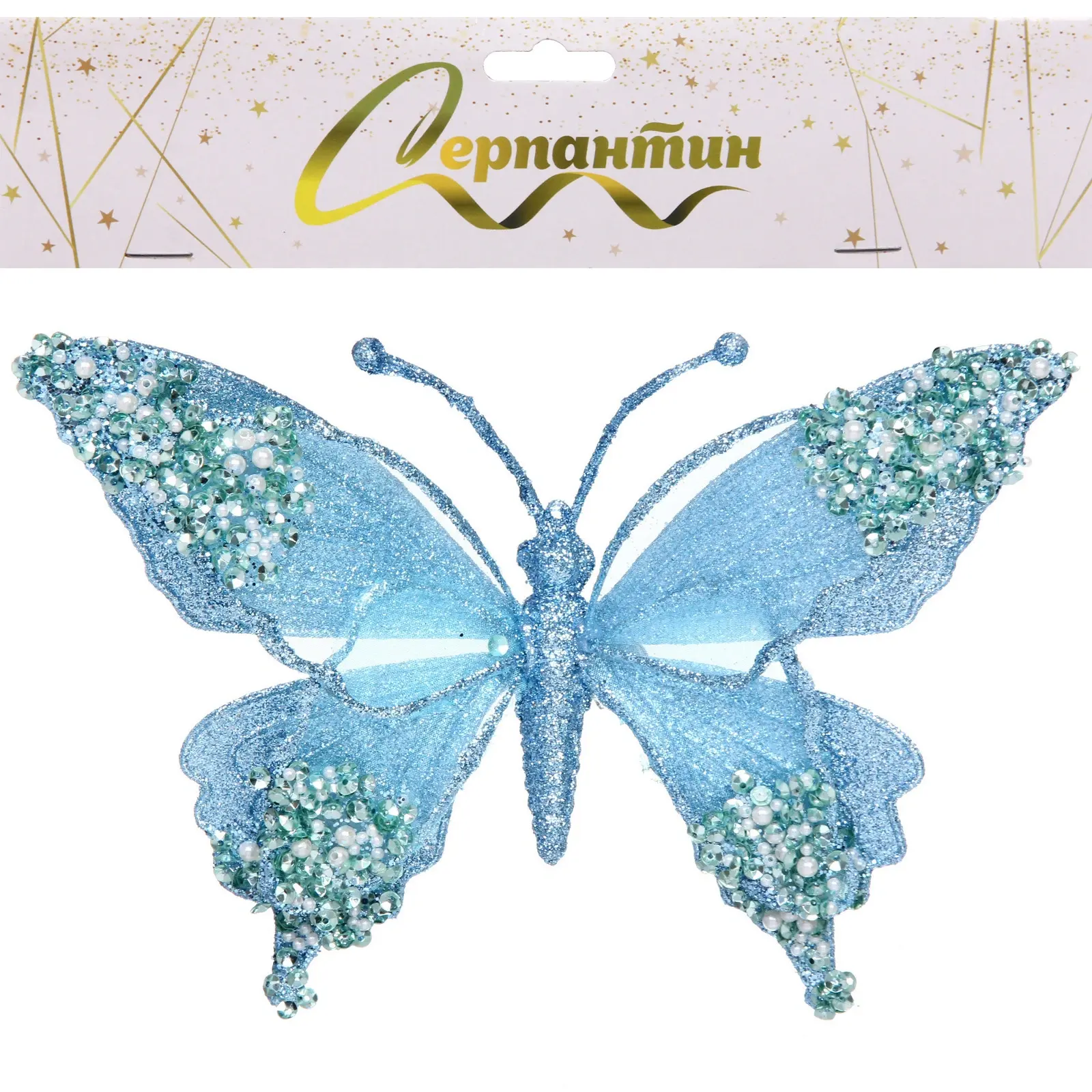 Это декоративное новогоднее украшение в форме бабочки поможет создать атмосферу сказочного зимнего праздника. Мягкий голубой цвет с блестящим покрытием и утонченным декором из бусин и страз добавляет нежности и утонченности, превращая каждое дерево или композицию в настоящее произведение искусства.