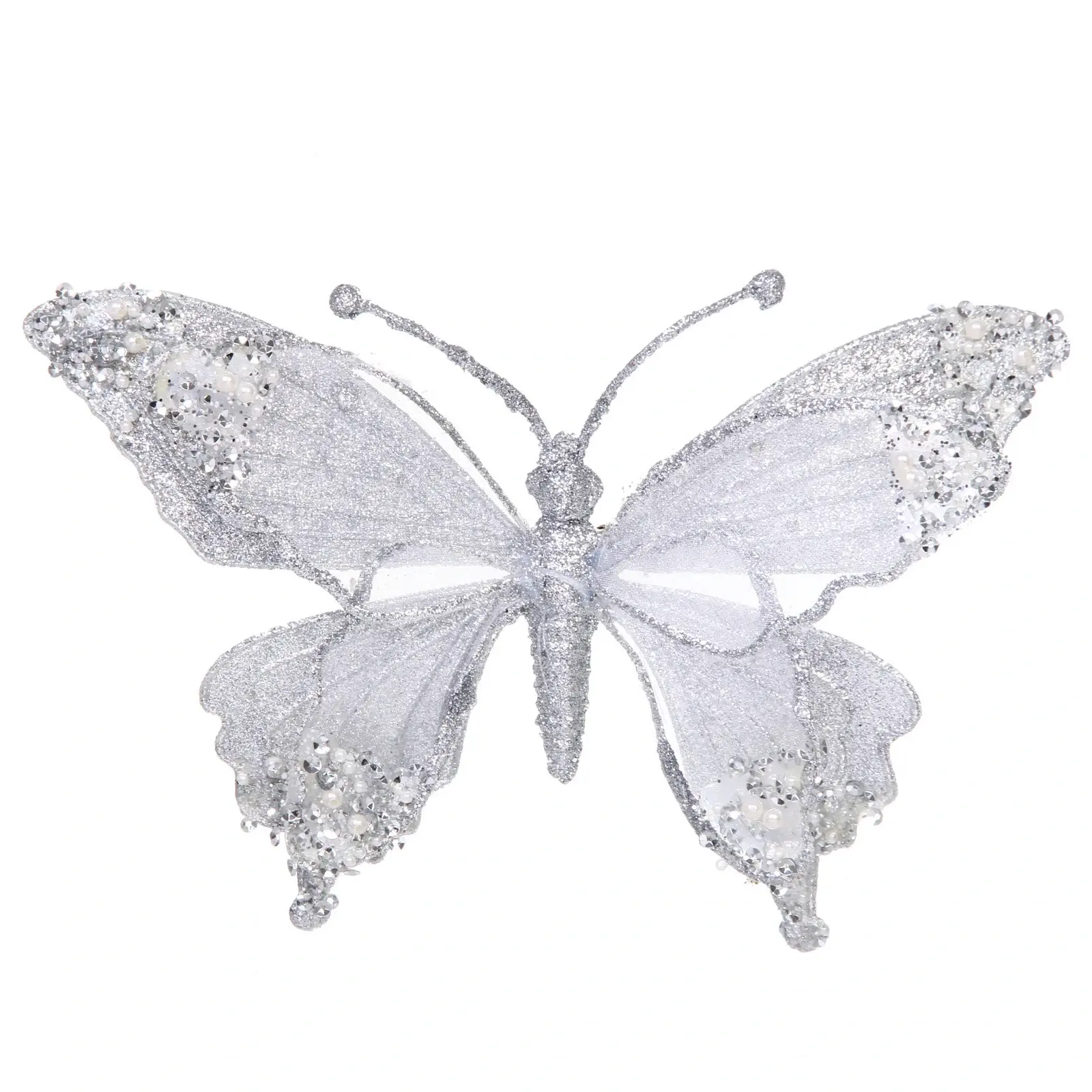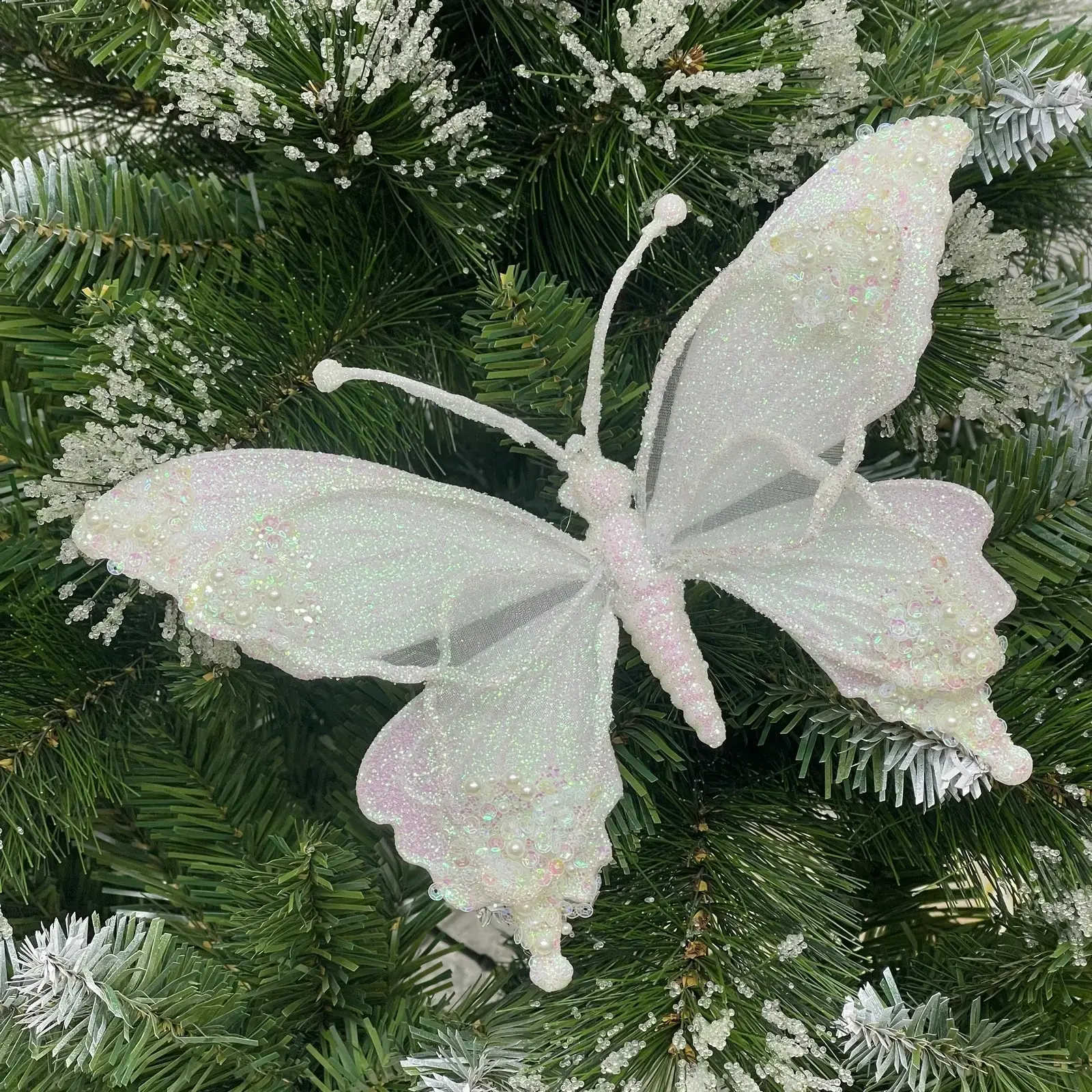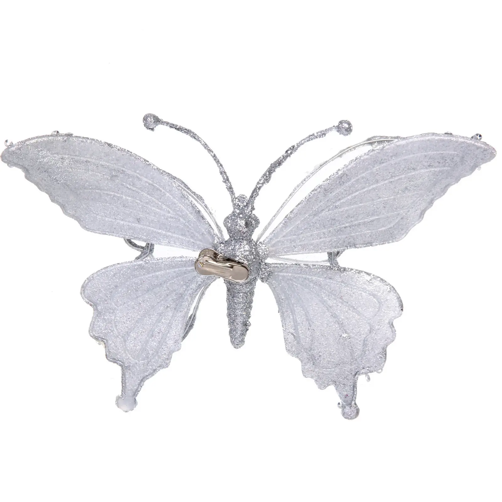 Украшение в виде бабочки «Изящный полет» создаст атмосферу праздника и добавит утончённости вашему новогоднему декору. Серебристое покрытие с глиттером отражает свет гирлянд, словно морозные узоры на стекле, а нежные линии крыльев придают композиции легкость и воздушность.