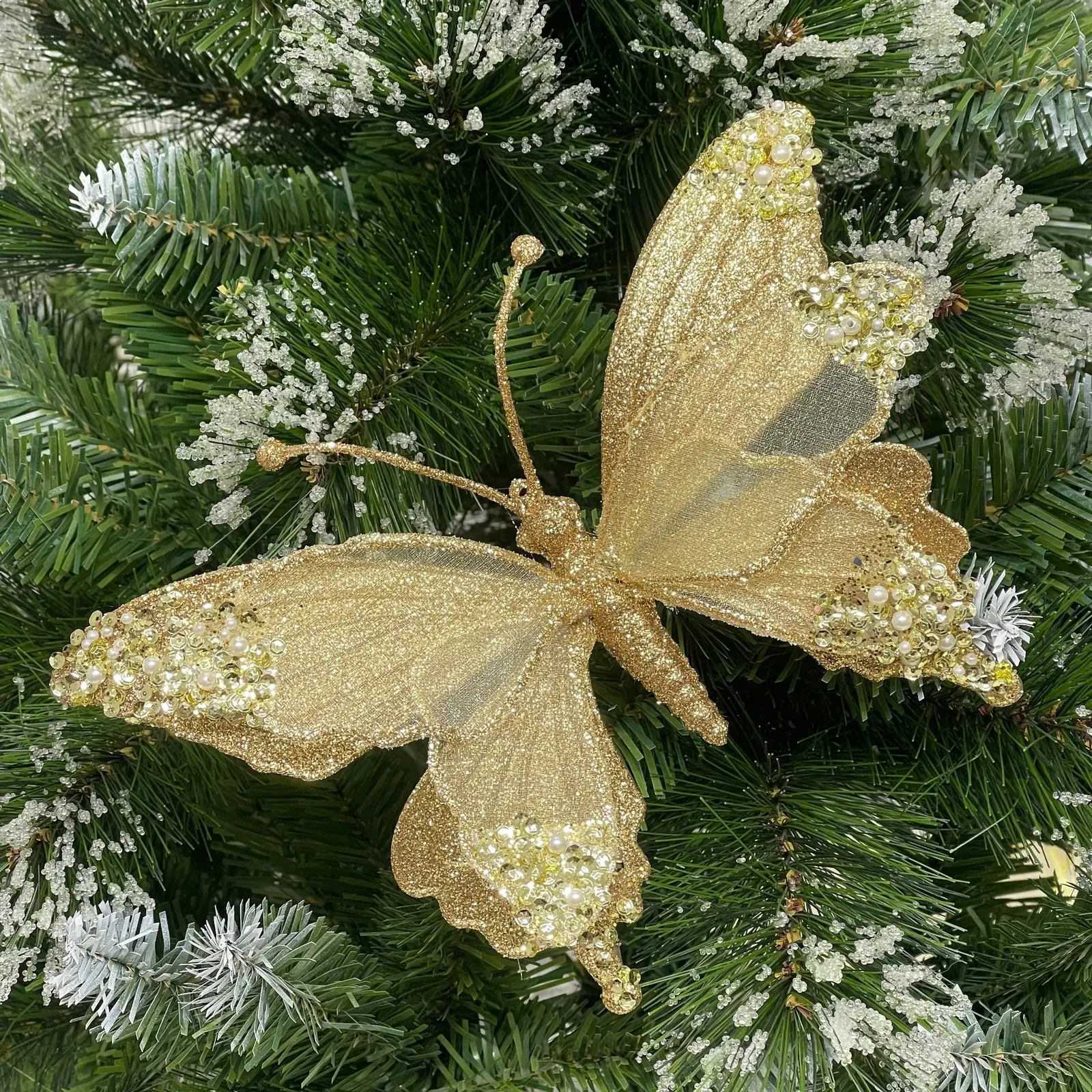 Бабочка подходит для украшения искусственных и живых елей, рождественских венков, подарочной упаковки или интерьерных композиций. Благодаря удобному зажиму на тыльной стороне, изделие можно легко и надежно закрепить на ветке или любом декоративном элементе.