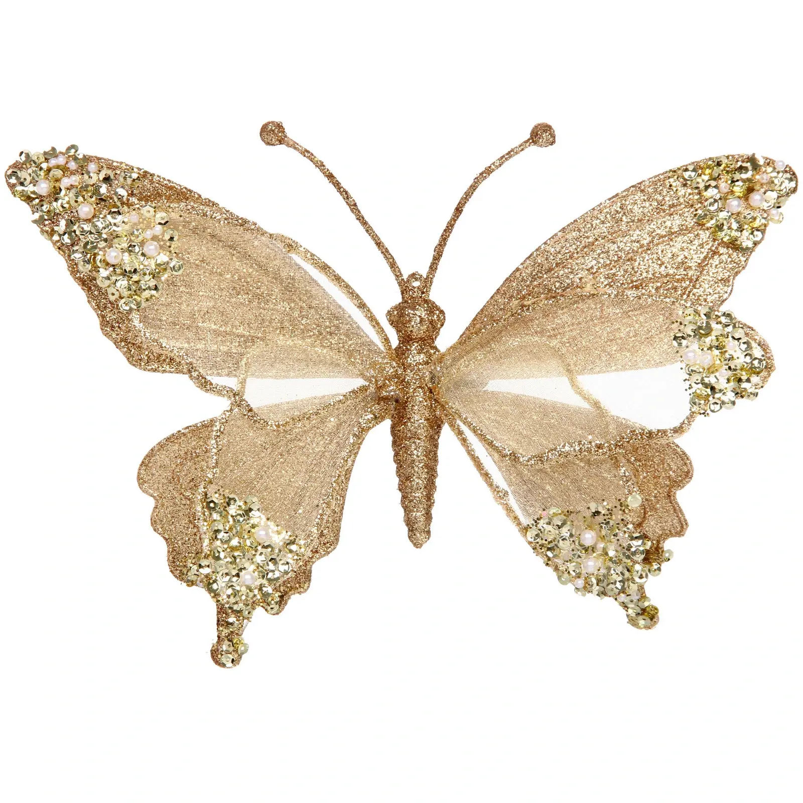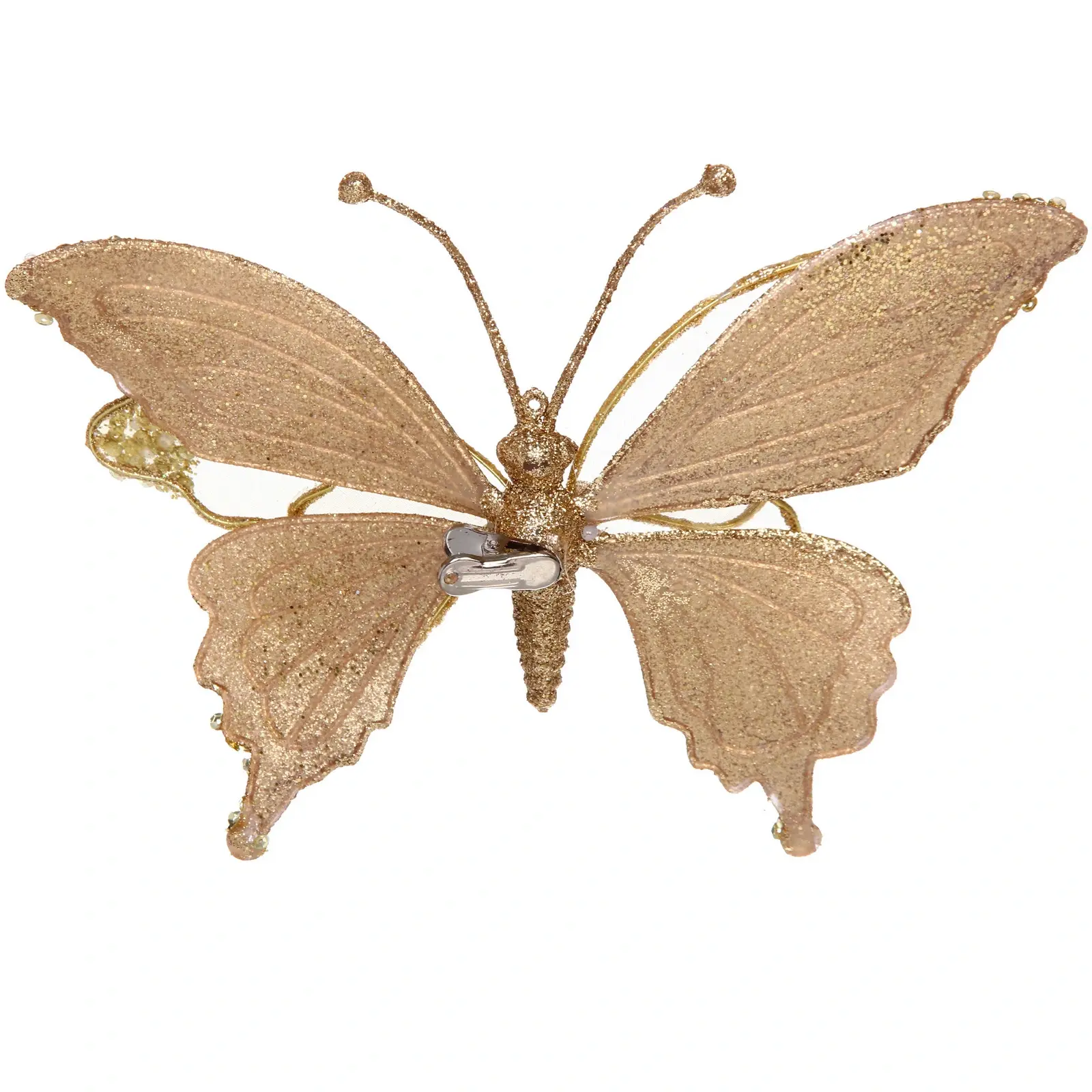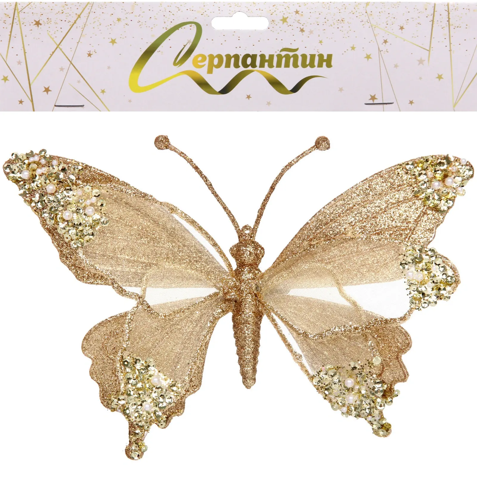 Элегантная декоративная бабочка в нежном оттенке шампань станет изысканным завершающим акцентом в оформлении вашей новогодней ёлки или праздничной композиции. Мерцающие блёстки, утончённые стразы и бусины создают атмосферу роскоши и уюта, отражая сияние гирлянд и свечей.