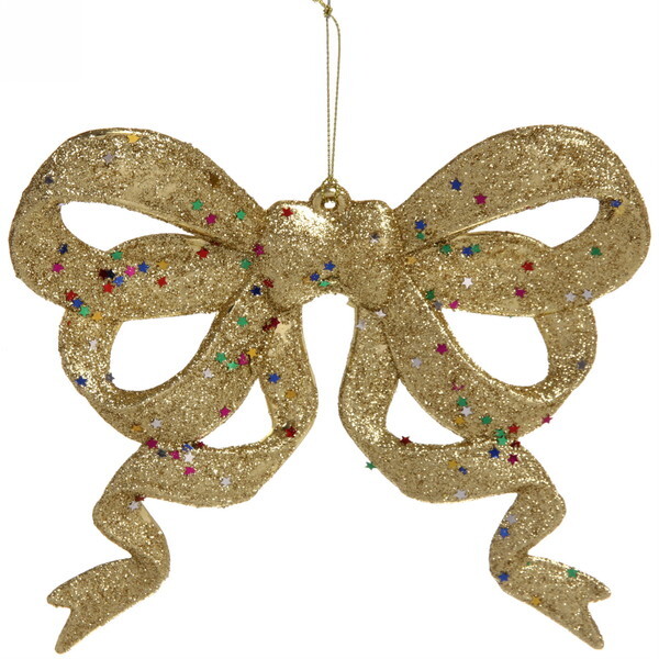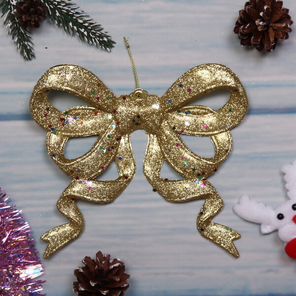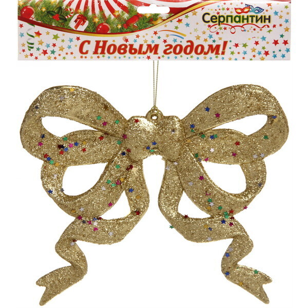 Создайте волшебную атмосферу Нового года с декором, который притягивает взгляды. Золотой бант с мерцающими блестками и разноцветными звездами станет изюминкой елочного убранства или эффектным украшением праздничного стола.