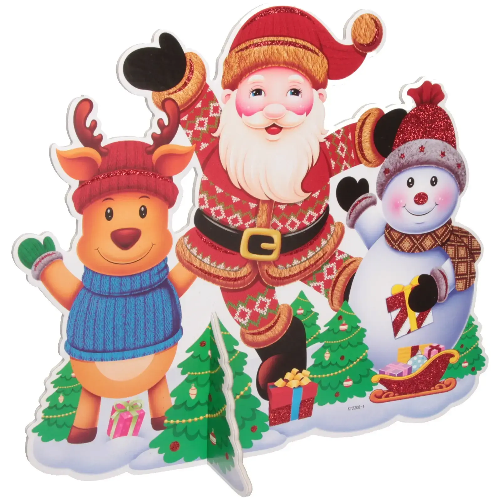 Это новогоднее украшение станет ярким акцентом в вашем интерьере, добавляя атмосферу волшебства и радости. С высотой 37 см, оно идеально подходит для украшения елки, стола или любого другого места в вашем доме. Праздничные персонажи — Санта-Клаус, олень и снеговик — выполнены в ярких и насыщенных цветах, что делает их привлекательными для детей и взрослых.
