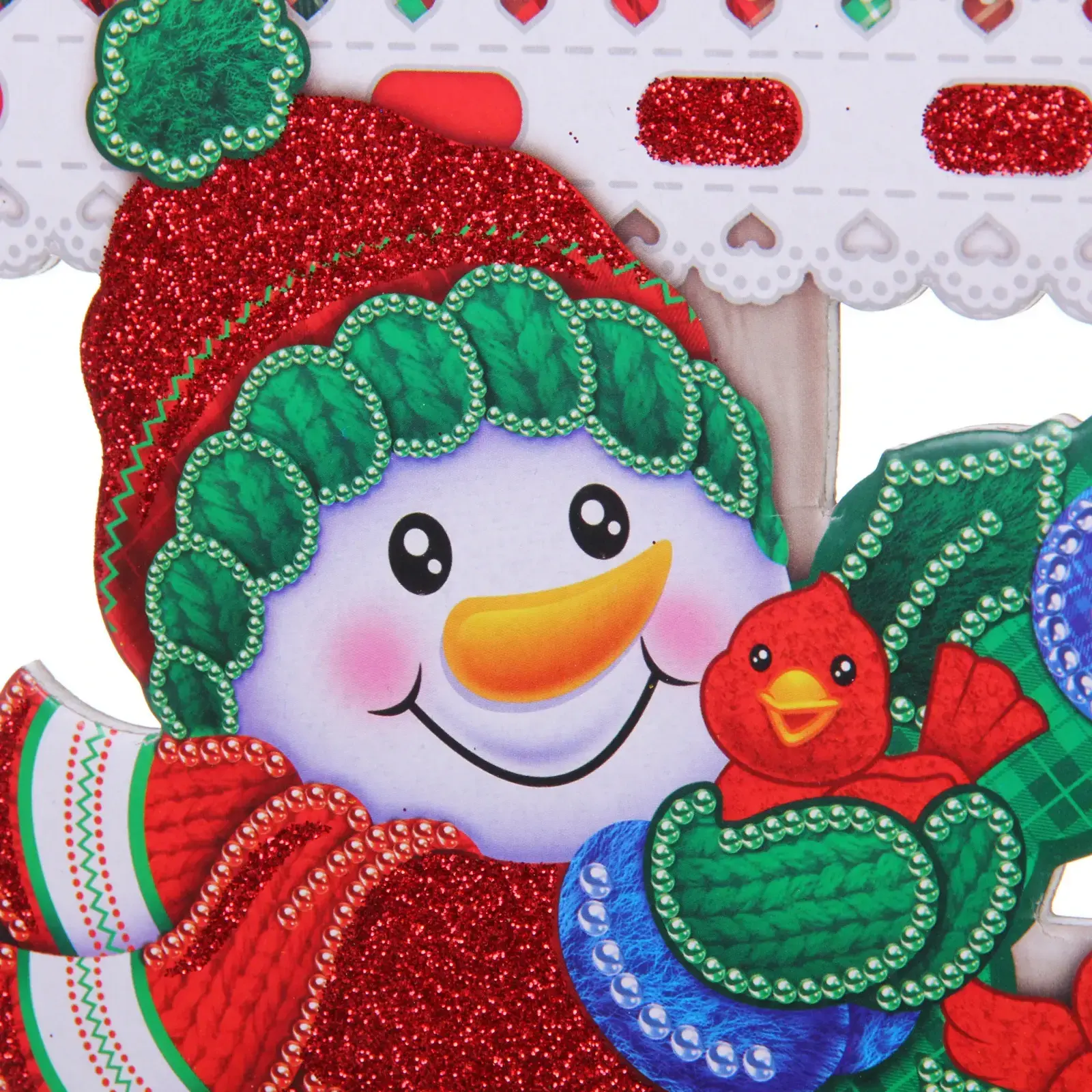 Это яркое новогоднее украшение в виде снеговика станет идеальным дополнением вашего праздничного декора. С его помощью вы сможете создать атмосферу уюта и радости, которая так важна в зимние праздники. Снеговик, одетый в красный зимний костюм и зеленую шапку, держит в руках рождественский венок, украшенный красными птицами и елочными игрушками. Это изделие не только украсит ваш дом, но и поднимет настроение всем вашим близким.